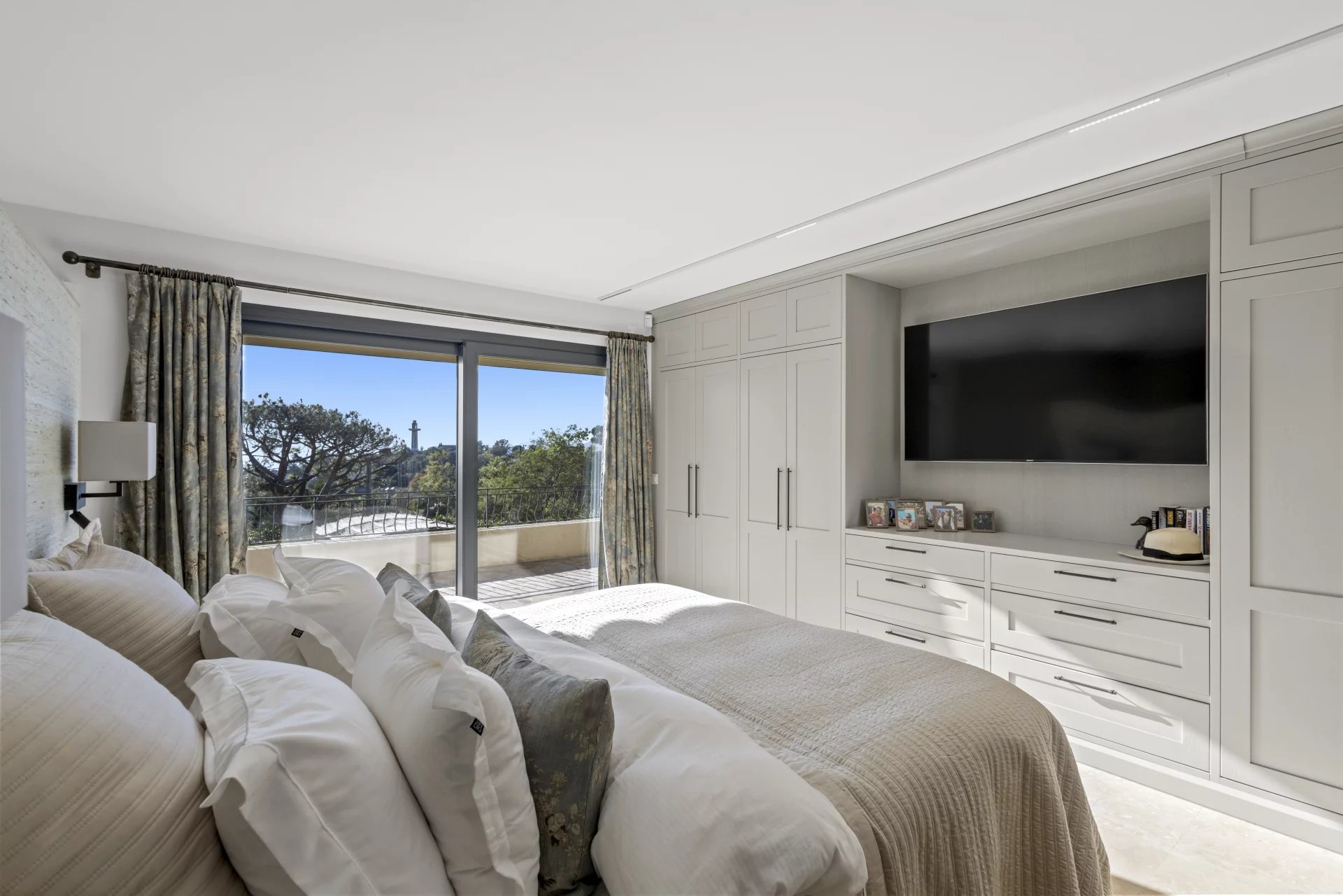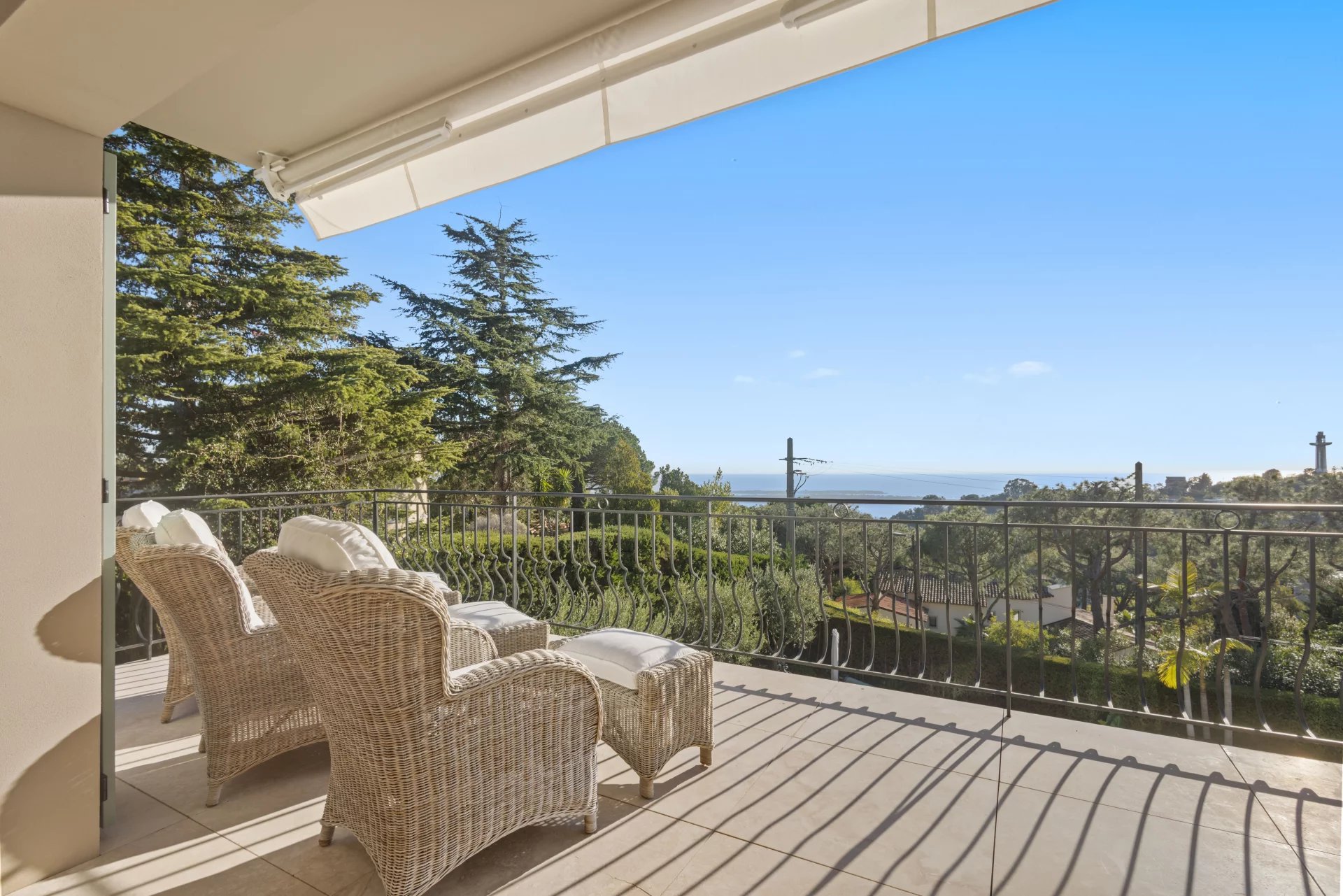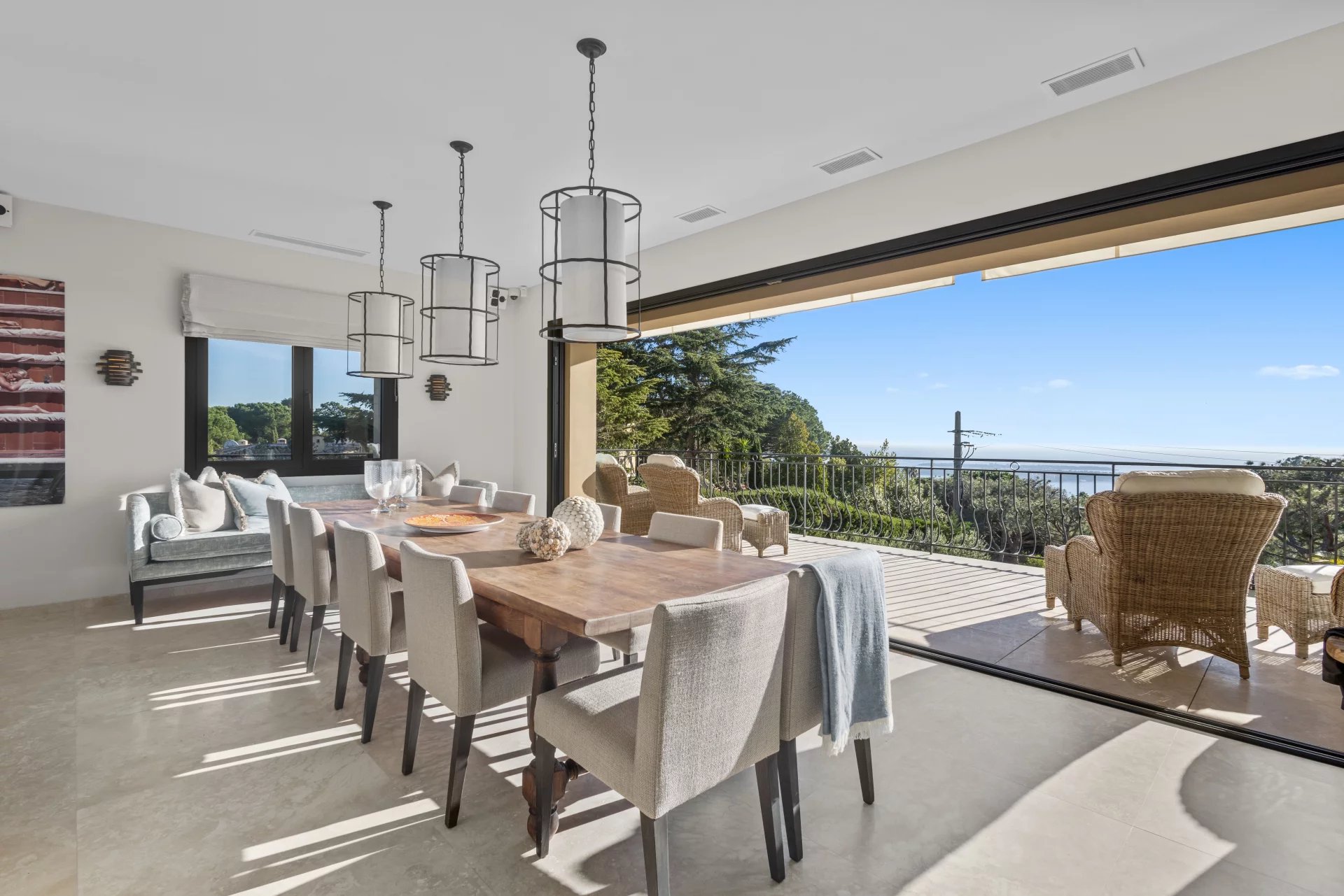 Poised on a hilltop of Super Cannes with sweeping views across the Mediterranean, this recently renovated Provençal villa artfully balances contemporary luxury with traditional southern French charm. The property's stone façade nestled among cypress trees and olive groves create an immediate sense of authentic regional character. Inside, the inviting living room centers around a rustic fireplace and flows seamlessly into an elegant dining area and chef-worthy kitchen equipped with premium appliances. Floor-to-ceiling glass doors throughout the main level blur the boundary between indoor refinement and the expansive sea-view terrace beyond. The villa's thoughtful floor plan accommodates 5 beautifully appointed bedrooms, a private study for remote work, and a spacious family room designed for relaxed gatherings. Among the property's most distinctive features is a wine cellar carved directly into the natural bedrock, illuminated with atmospheric blue lighting to showcase a curated collection. Year-round comfort is ensured through underfloor heating and air conditioning systems. The meticulously landscaped grounds include a heated swimming pool with stone surround, a covered outdoor dining area, generous garage space, and a pétanque court—the perfect setting for leisurely Provençal afternoons with family and friends.