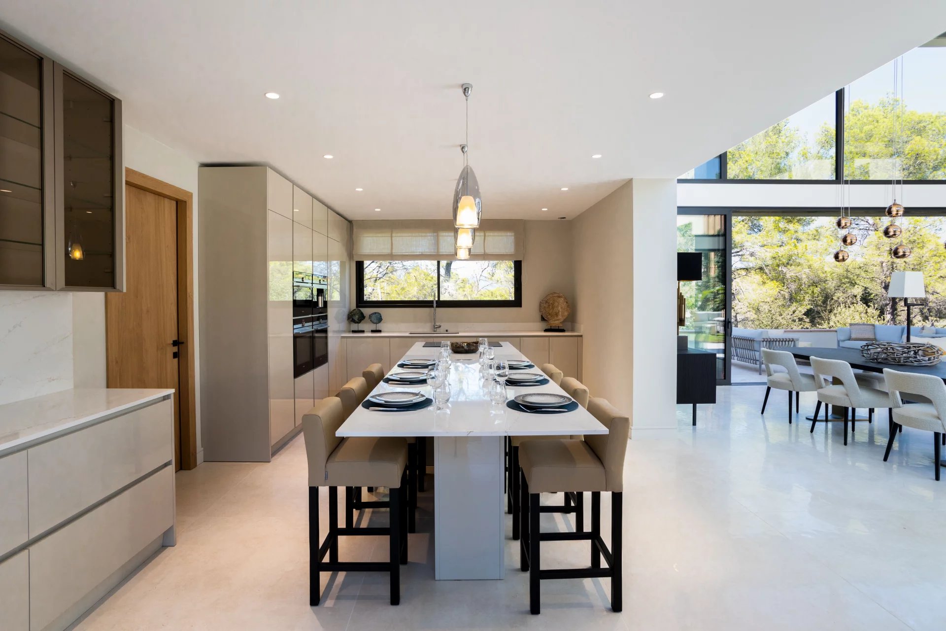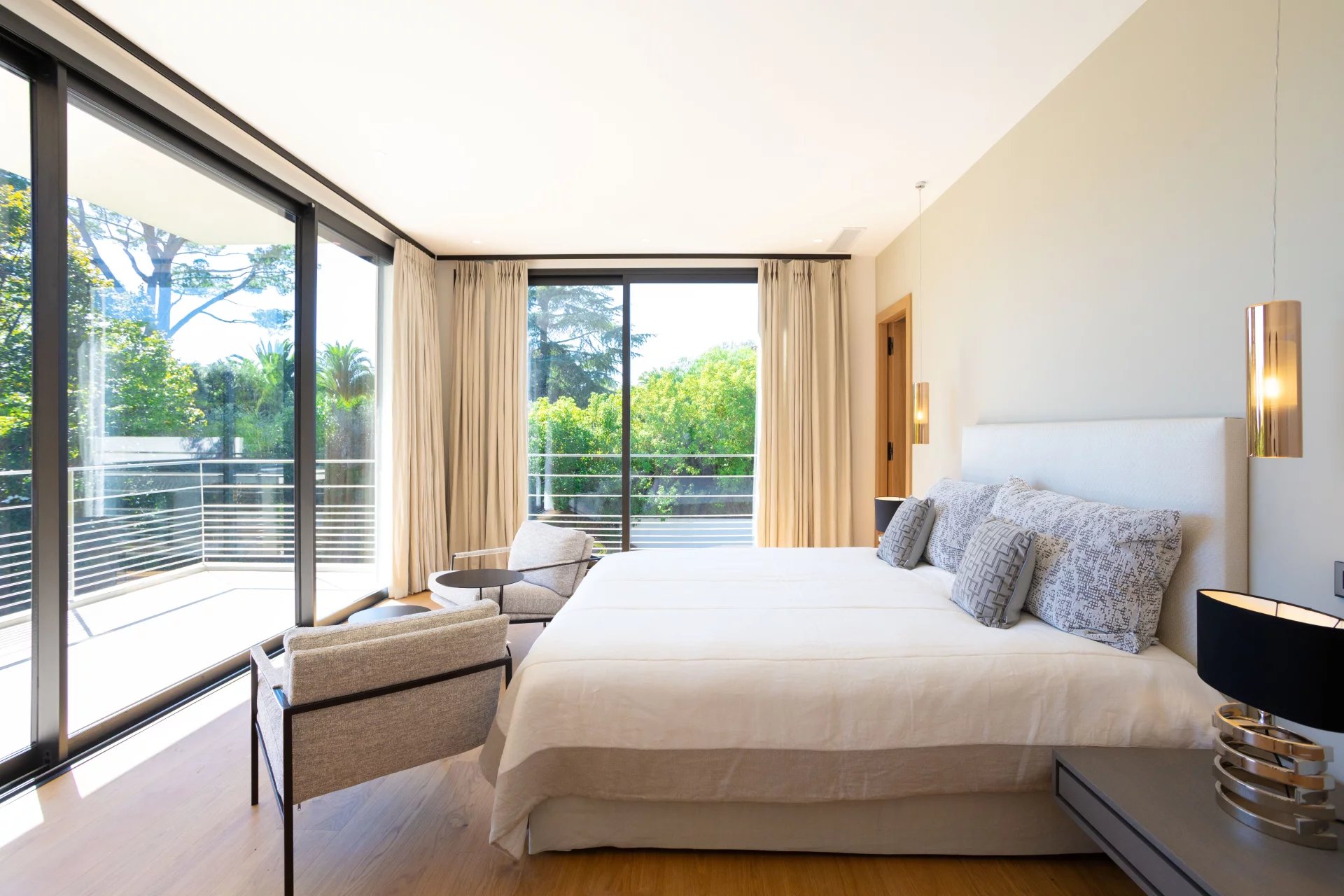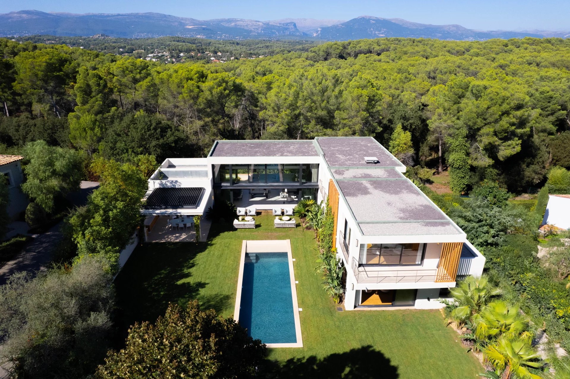 Nestled within a private, 24/7 secured estate in Mougins, this newly completed architectural masterpiece redefines modern Mediterranean luxury. Completed in 2023, the 700 sq.m residence harmonizes bold geometric forms with its natural surroundings through expansive walls of glass that dissolve boundaries between interior and exterior living. The heart of the home features a dramatic double-height living space where natural light cascades through floor-to-ceiling windows, illuminating the carefully curated interior design that balances minimalist aesthetics with warm materiality. The main level houses 2 ensuite bedrooms including an exceptional owner's suite with custom dressing room. The premium kitchen showcases museum-quality finishes centered around a monolithic island for both culinary endeavors and elegant entertaining. 3 additional en-suite bedrooms occupy the upper level, while the lower floor serves as a private wellness and leisure retreat, featuring a state-of-the-art cinema, temperature-controlled wine cellar, fitness studio, and recreational spaces. The 14×4m heated swimming pool anchors the meticulously landscaped grounds, complemented by a summer kitchen and thoughtfully positioned terraces that capture the essence of refined alfresco living. An integrated lift provides effortless movement between levels, embodying the property's commitment to seamless luxury living.