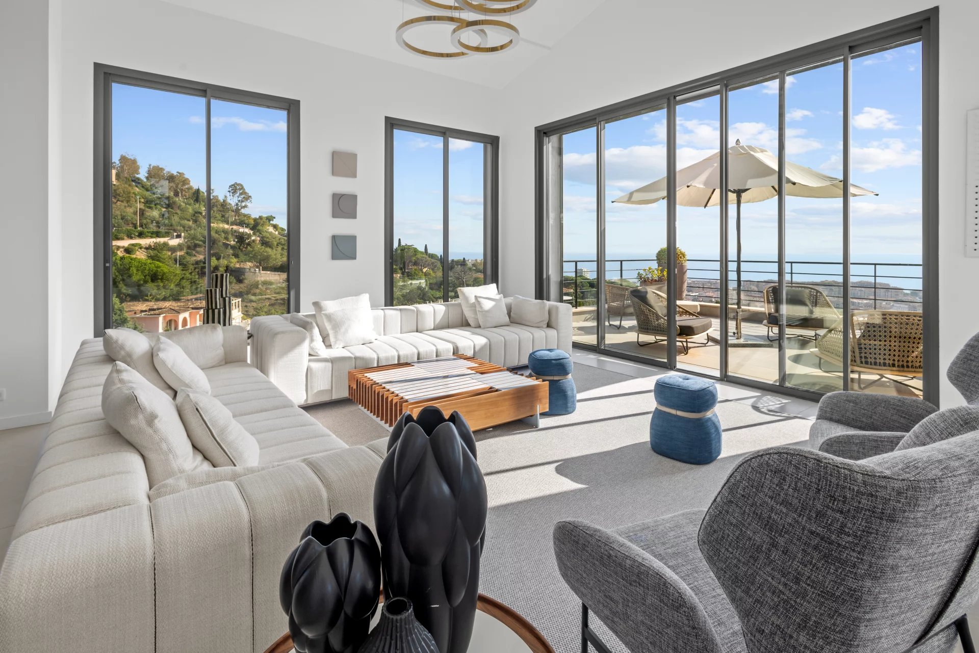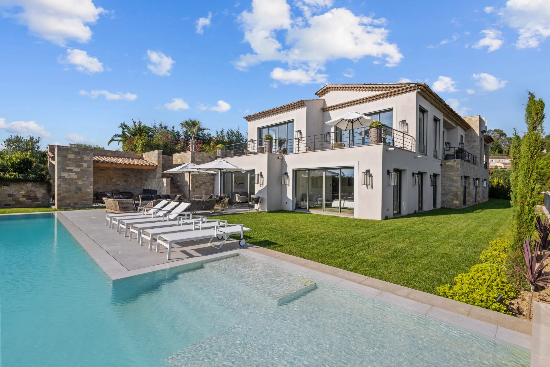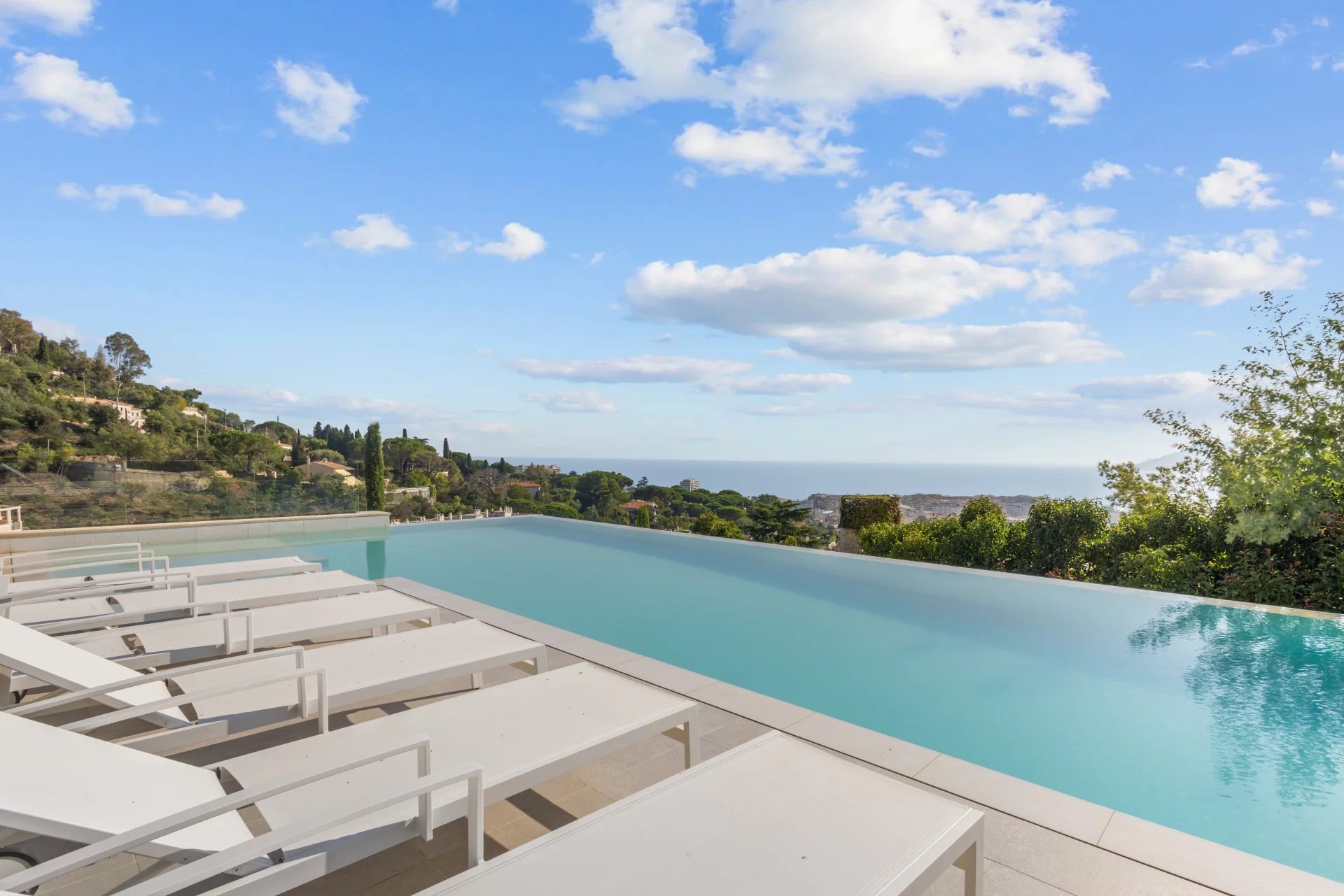 Set on the highly sought-after hills of Cannes Croix des Gardes, this villa enjoys sweeping views over the Mediterranean and the Estérel mountains. The main level features a generous open-plan living area with a high-end kitchen, reception spaces, and an en-suite bedroom. On the garden level, a second living area with its own kitchen opens directly onto the infinity pool. The principal suite offers a bespoke dressing room, complemented by three additional en-suite bedrooms. Landscaped gardens, a triple garage, and additional parking complete this exceptional hillside property.