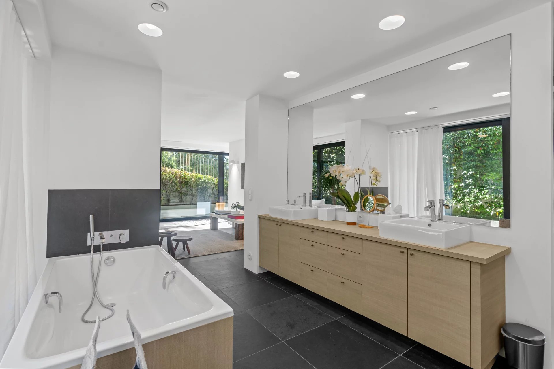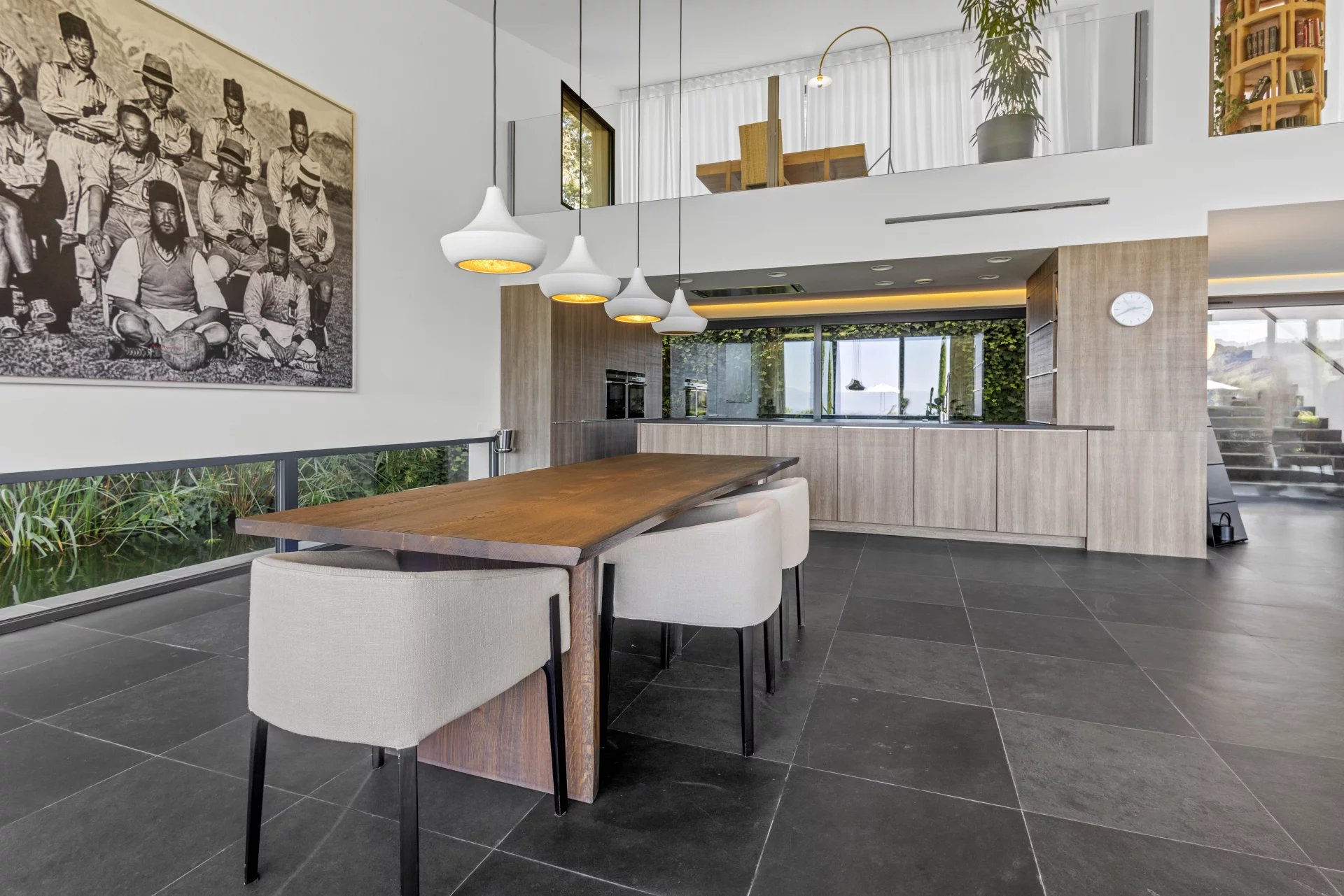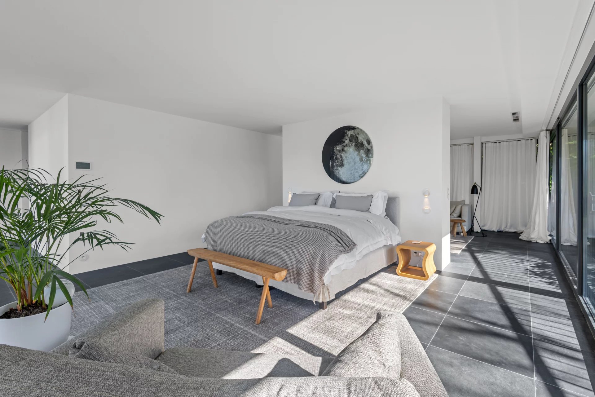 Perched on the undulating hills of Tanneron, this contemporary villa—masterfully designed by Belgian architect Augustin Rubbers—commands panoramic mountain views. The light-filled main level features a double living room anchored by a fireplace, where floor-to-ceiling windows frame the landscape like living art. The property's minimalist aesthetic continues on the ground floor through a spacious dining area and sleek kitchen beneath a dramatic double-height ceiling. The main level also includes a luxurious master suite with dressing room and sitting room, 2 further en-suite bedrooms, and a laundry. On the second floor, 3 additional en-suite bedrooms with direct garden access provide ample accommodation for guests. Outside, the grounds achieve geometric perfection with an astonishing 34-meter lap pool stretching alongside manicured lawns, punctuated by cypress trees. Meticulously planned gardens with fruit trees complete this modernist sanctuary where architectural precision meets Mediterranean sensibility.