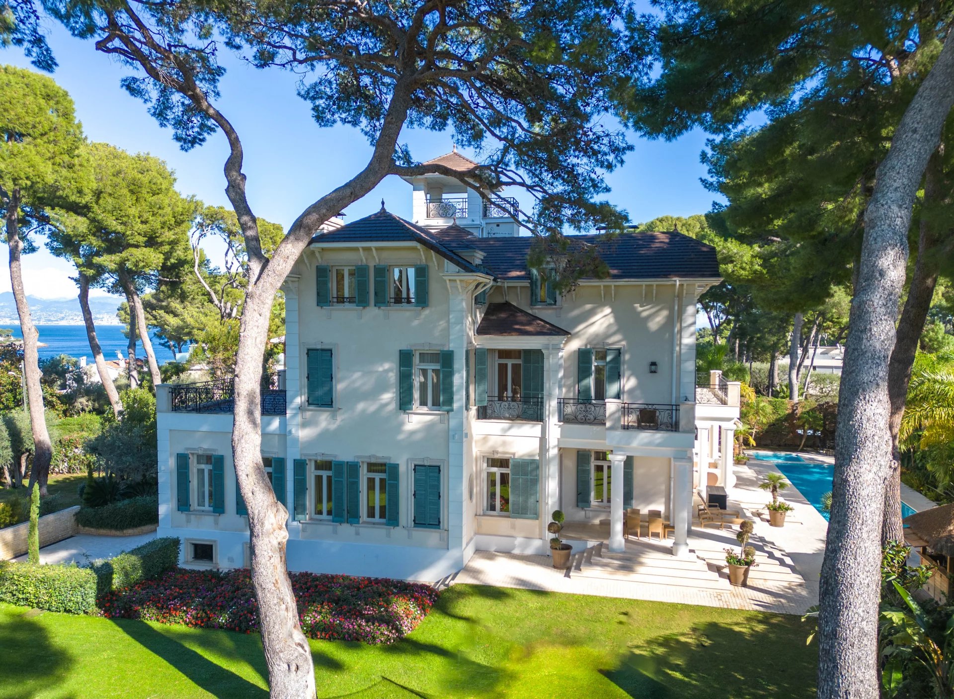 Set within a private estate in Cap d’Antibes, this elegant 1920s villa stands out for its distinctive architecture and exceptional setting. Arranged over three levels, the home opens onto a grand entrance hall leading to a fully equipped gourmet kitchen, dining room and a bright living room, all extending to the terraces and pool area. The upper floors host seven suites, including a principal suite with a private dressing room and a sea-view terrace. Features include ornate ceiling mouldings, marble floors and crystal chandeliers, while the basement level offers a complete wellness area with sauna, hammam, gym and an impressive wine cellar. Landscaped gardens with mature pines frame the infinity pool and multiple entertaining terraces—an exceptional property in one of the Riviera’s most exclusive addresses.