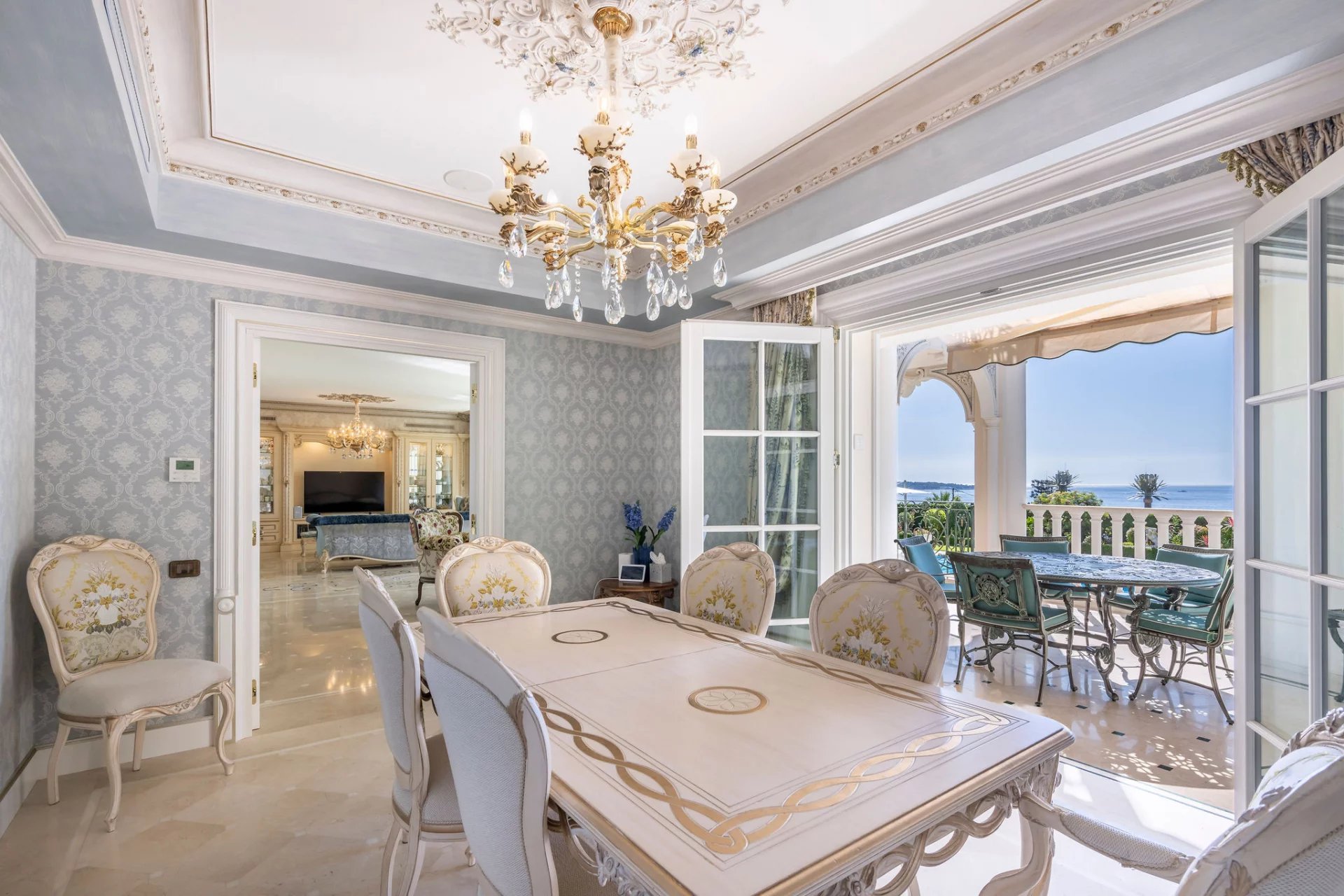 This stately neoclassical villa in Super Cannes stands as a monument to refined Mediterranean living, where baroque-inspired architectural elements create an immediate sense of grandeur. The symmetrical façade with its impressive central staircase, ornate wrought-iron balustrades, and classical columns establishes a commanding presence amid meticulously landscaped grounds. The interiors reflect a commitment to aristocratic elegance, with lavish ceiling moldings, crystal chandeliers, and richly detailed millwork throughout. The living spaces showcase a palette of creams and soft pastels, complemented by marble flooring inlaid with decorative motifs. The living room opens to panoramic sea views through floor-to-ceiling French doors, while the master suite continues the theme of regal luxury with private terrace access. A high end kitchen combines a craftsmanship with modern functionality, featuring custom cabinetry, and premium granite surfaces. The 7 bedrooms are supplemented by a separate guest apartment ensuring privacy for visitors. The estate's outdoor domain is equally impressive, centered around an azure swimming pool that mirrors the sea beyond.