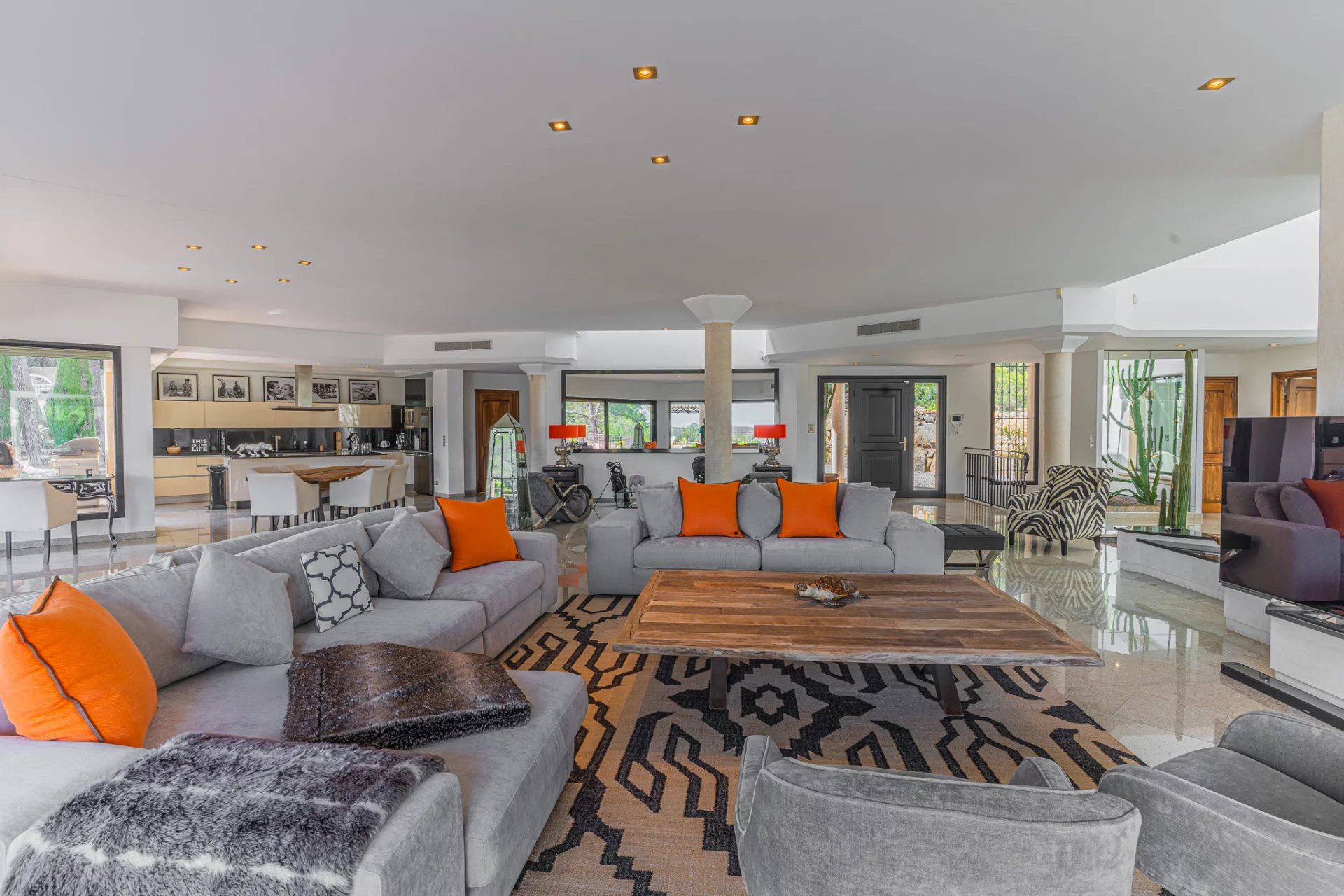 In Domaine du Redon, Mougins, this contemporary Provençal villa spans 3.2 hectares of pristine grounds near Cannes. Nestled among mature pines and cypress trees, it blends modern comfort with Mediterranean architecture. The property features clay-tiled roofing and columned terraces leading to a geometric pool. Expansive terraces and a pétanque court accommodate grand gatherings while maintaining intimate spaces. The 150m² living area showcases sophisticated design with high ceilings, polished stone floors, and an open kitchen. A distinctive indoor garden atrium features towering cacti and artistic installations. The layout offers two zones: the main residence with three en-suite bedrooms and dressing rooms, plus a separate guest wing with three additional en-suite bedrooms and two fully-equipped kitchens. Located near Mougins School and historic villages, this property combines seclusion with accessibility, representing finest Riviera living with extension potential.