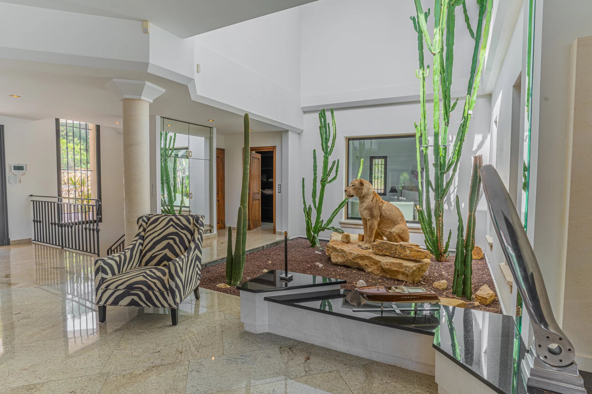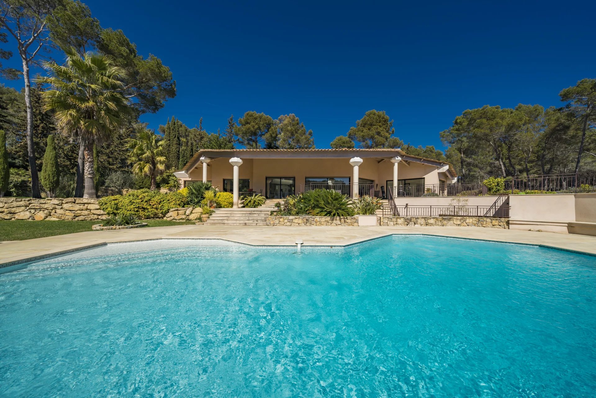 This contemporary villa spans 3.2 hectares of pristine grounds near Cannes. Nestled among mature pines and cypress trees, it blends modern comfort with Mediterranean architecture. The property features clay-tiled roofing and columned terraces leading to a geometric pool. Expansive terraces and a pétanque court accommodate grand gatherings while maintaining intimate spaces. The 150m² living area showcases sophisticated design with high ceilings, polished stone floors, and an open kitchen. A distinctive indoor garden atrium features towering cacti and artistic installations. The layout offers two zones: the main residence with three en-suite bedrooms and dressing rooms, plus a separate guest wing with three additional en-suite bedrooms and two fully-equipped kitchens. Located near Mougins School and historic villages, this property combines seclusion with accessibility, representing finest Riviera living with extension potential.