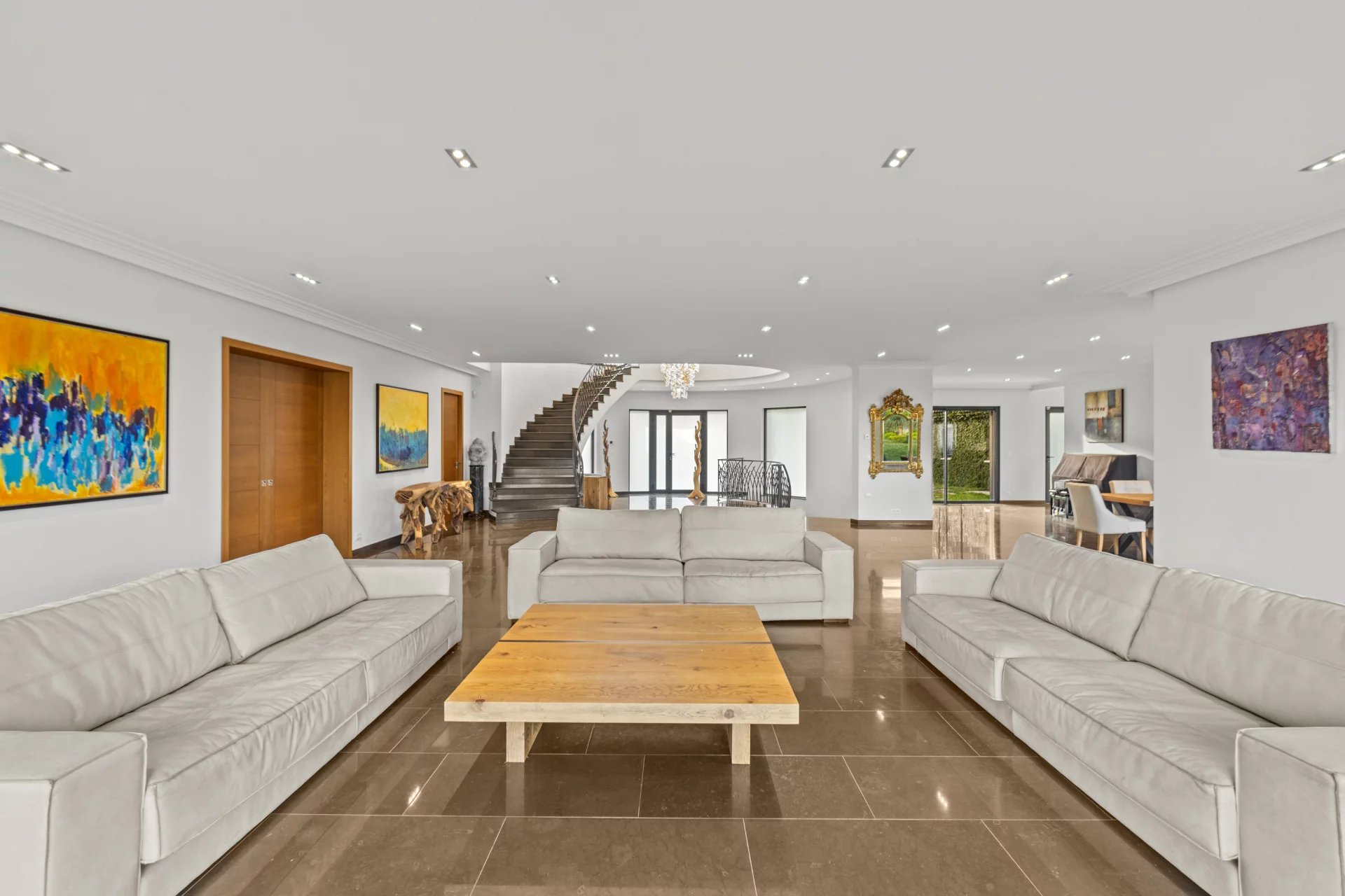 Crowning Roquefort-les-Pins, this architectural masterpiece commands an incomparable setting with sweeping panoramic vistas of the azure Mediterranean, majestic mountains, and verdant woodlands. Perched in a dominant position ensuring complete privacy, this secluded sanctuary offers the ultimate tranquility across 1.6 hectares (4 acres) of meticulously landscaped grounds, adorned with centuries-old olive trees that whisper tales of Provençal history. Constructed in 2018 with uncompromising attention to detail, this 570m² residence exemplifies contemporary luxury living. The interior unfolds with a dramatic double-height entrance hall crowned by a spectacular chandelier, flowing into expansive living spaces featuring floor-to-ceiling windows that frame the breathtaking landscape. The heart of the home seamlessly integrates a sophisticated open-concept kitchen with the main living area, complemented by a separate utility room, intimate media lounge, and four sumptuous en-suite bedrooms, each opening onto private terraces. The garden level houses a fully independent two-room apartment with its own kitchen, offering versatile accommodation for guests or staff. An additional multipurpose space provides the perfect setting for a state-of-the-art home cinema or private fitness sanctuary. Outdoor amenities include a heated infinity swimming pool, an elegant pool house with summer kitchen for alfresco entertaining, a traditional pétanque court, and a spacious four-car garage. This extraordinary property represents a once-in-a-lifetime opportunity to acquire a residence of unparalleled distinction in one of the Côte d'Azur's most coveted locations.