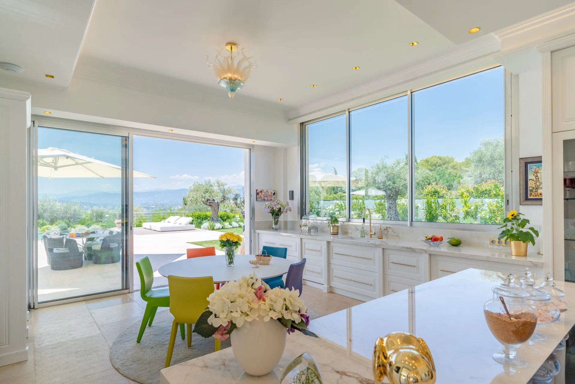 Fully renovated Mediterranean villa in Mougins, offering around 550 sq m of living space. Set in a quiet residential area just minutes from shops, it enjoys a commanding position with panoramic countryside views and complete privacy. The interiors feature a refined contemporary design with large floor-to-ceiling sliding glass doors. The open-plan layout brings together the living, dining and entertaining areas. Outside: a heated saltwater pool, several relaxation areas, and a covered outdoor lounge under a bamboo pergola. The villa offers six en-suite bedrooms, including a principal suite with a dressing room and integrated home cinema. Additional amenities include a gym, a cinema room, a double garage with direct access to the house, and ample parking.