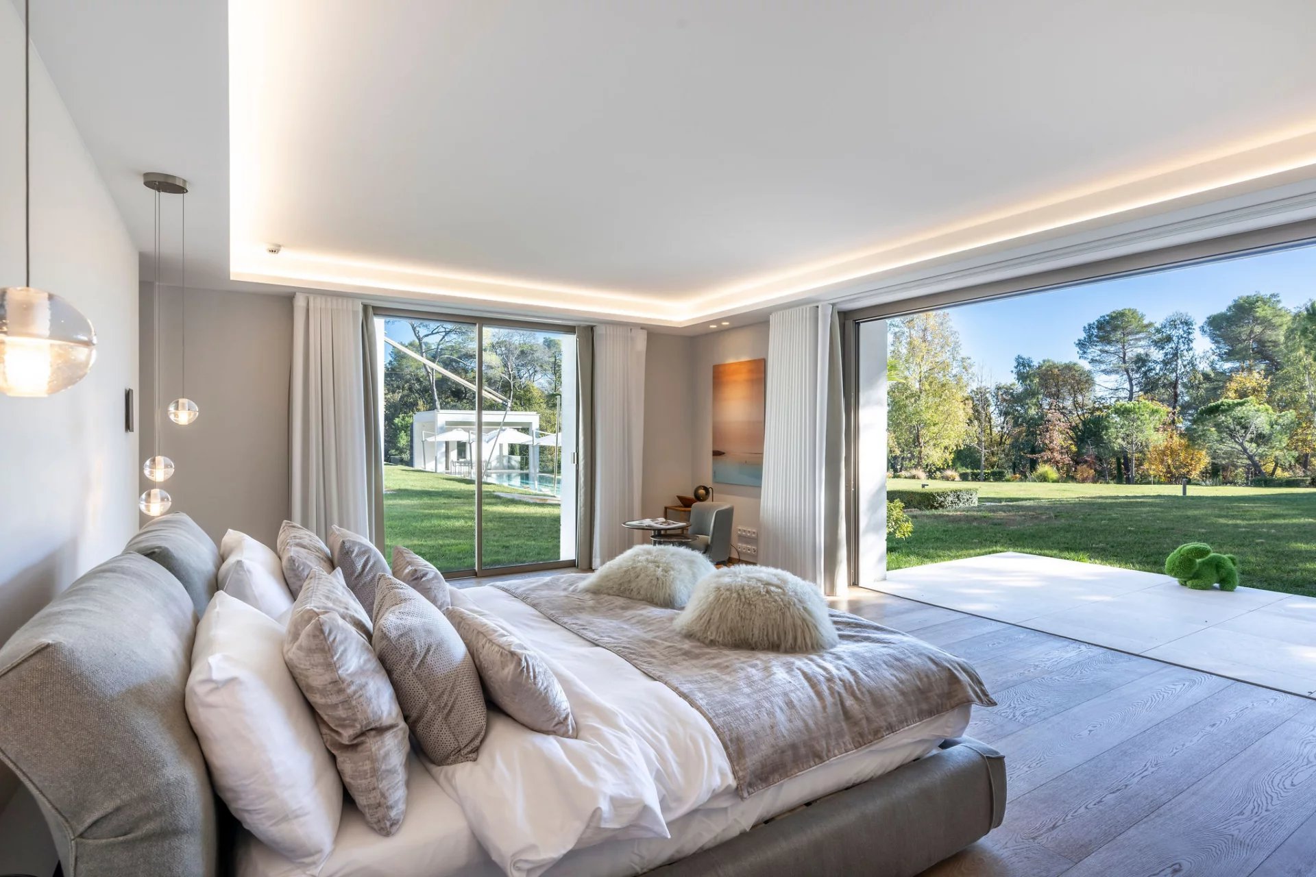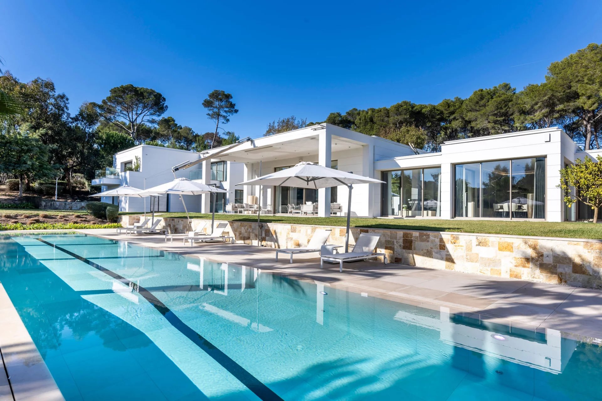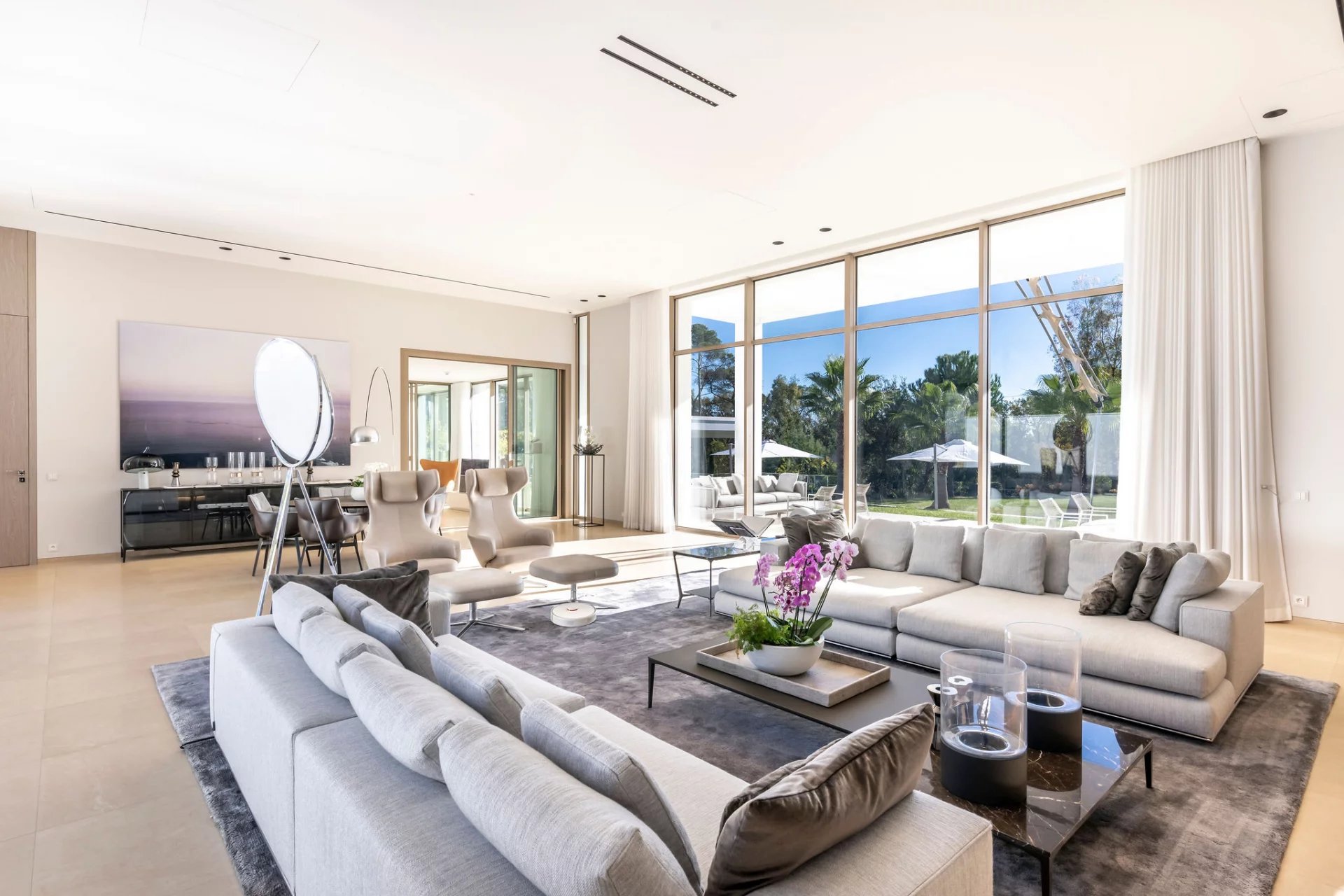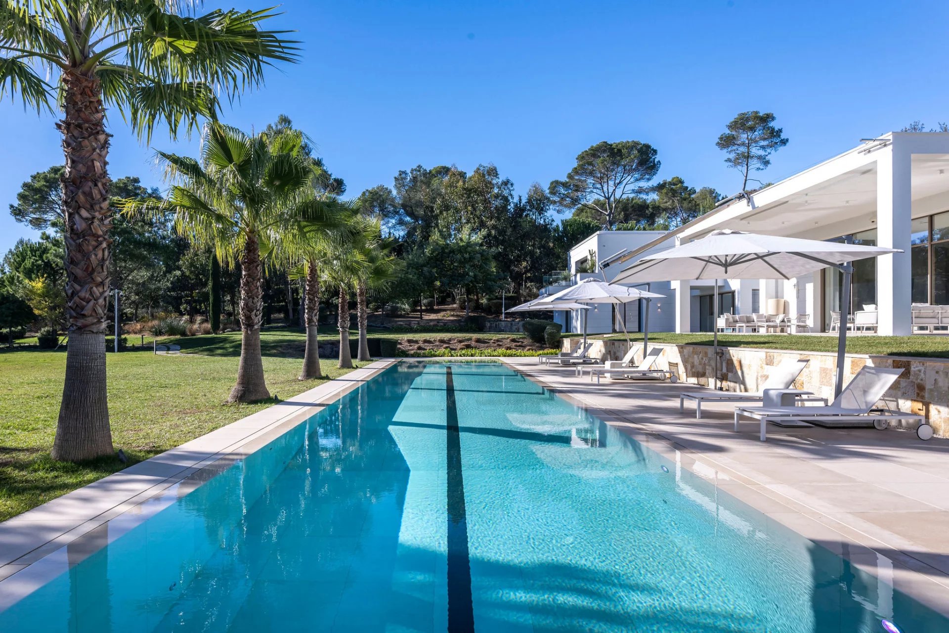 Co-exclusivity: In a coveted address within Mougins, this architectural masterpiece redefines contemporary luxury living through its bold geometric volumes and seamless integration with the surrounding landscape. Set within 1.3 hectares of meticulously landscaped grounds, the property presents a striking silhouette with its crisp white façades, green roof elements, and LED lighting system that transforms the estate at nightfall. The villa's 1,100 sqm interior showcases exceptional spatial design, with soaring ceilings and walls of glass creating an atmosphere of boundless light and space. The remarkable reception room serves as the home's centerpiece, a state-of-the-art kitchen that flows into an elegant dining area. 9 sumptuous en-suite bedrooms, including a magnificent master suite offer unparalleled comfort. The comprehensive amenities include a professional cinema, serene spa with sauna, temperature-controlled wine cellar. A discreet elevator connects the villa's multiple levels. Outdoors, the spectacular 25-meter heated pool extends from the main structure, complemented by a fully-equipped pool house. The estate's functionality is enhanced by an independent caretaker's residence, generous garage, and ample parking accommodations. This exceptional property represents the pinnacle of technologically advanced living, with comprehensive home automation systems controlling every aspect of the environment with effortless precision.