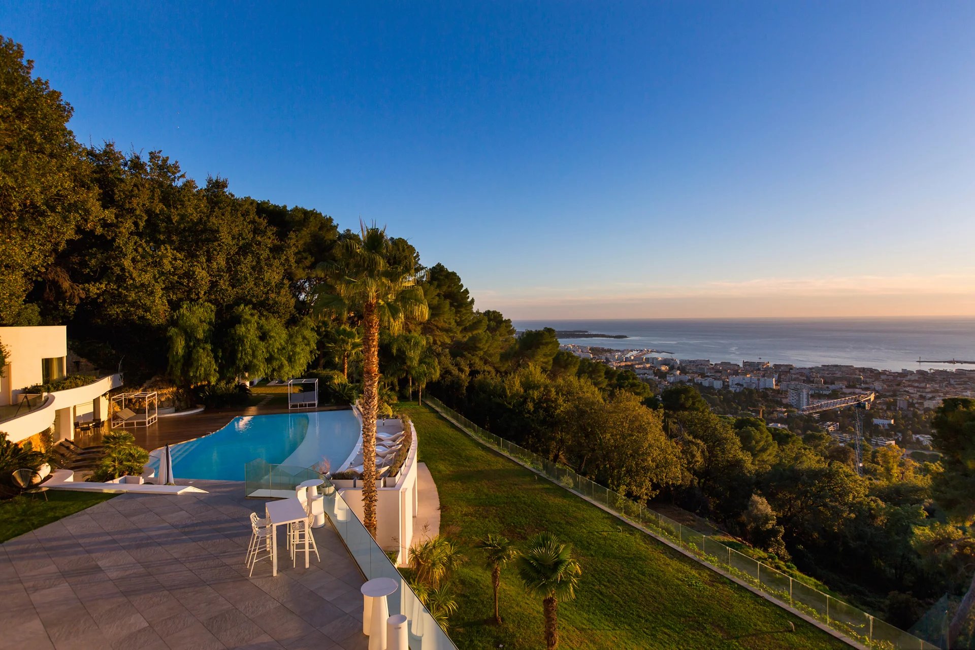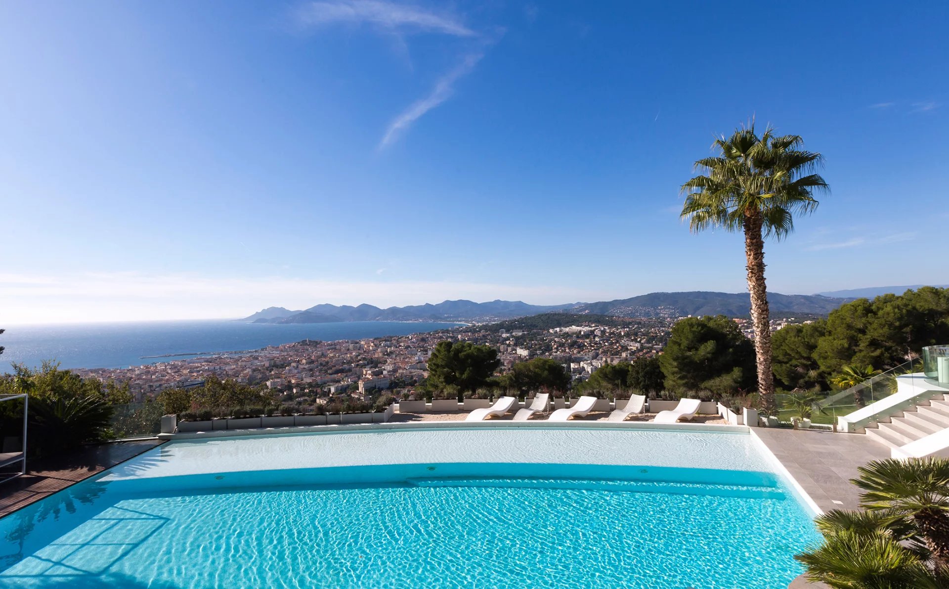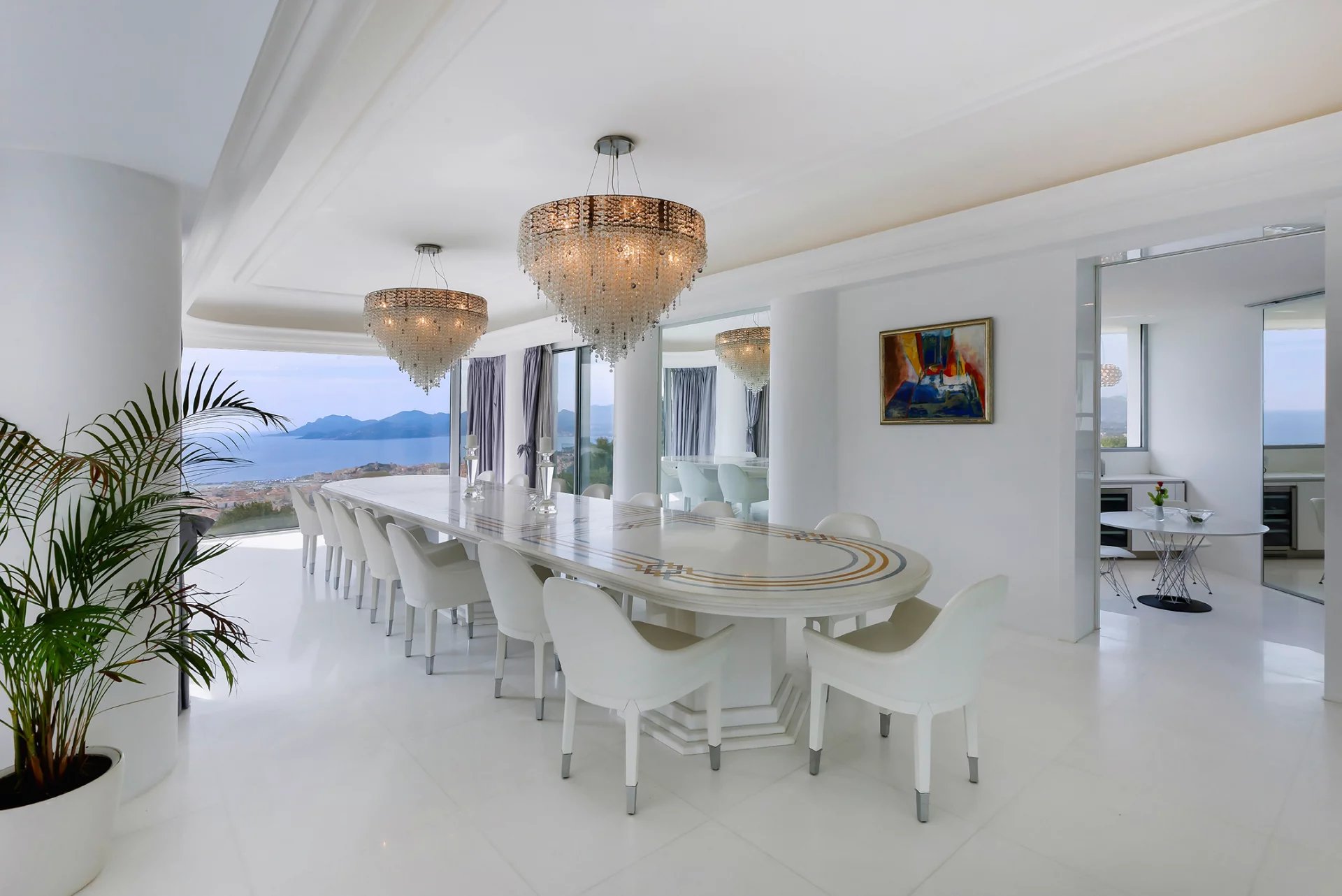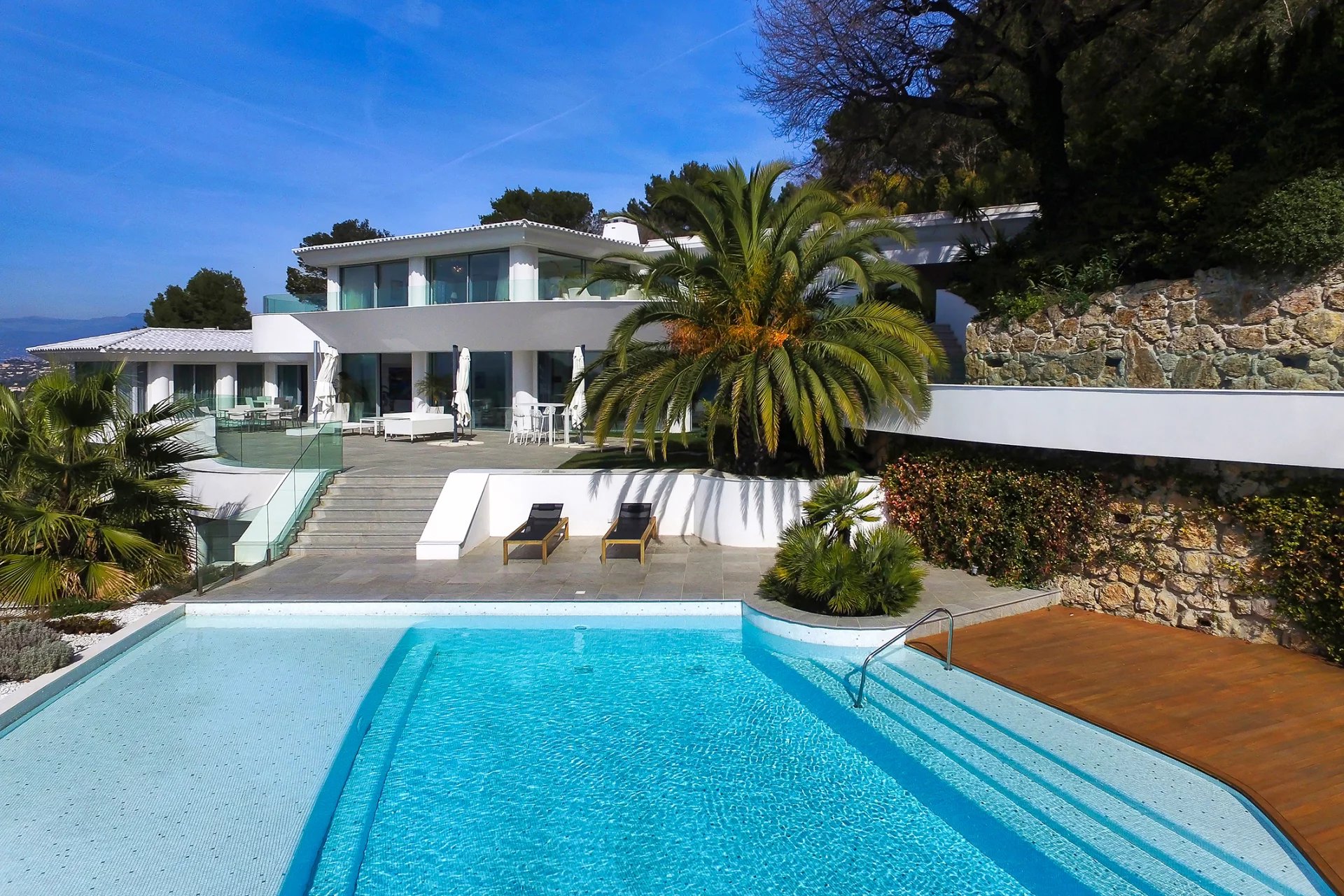 In an exclusive area of Cannes Californie, this spectacular contemporary villa represents the pinnacle of French Riviera luxury real estate. The architectural masterpiece, commanding breathtaking views across the Bay of Cannes and the Esterel mountains, stands as a testament to modern Mediterranean living. Set on a 13,750-sqm plot, the 2,000-sqm residence seamlessly blends indoor and outdoor living spaces, exemplified by floor-to-ceiling windows that frame the azure Mediterranean waters. The property's curved elements create a harmonious dialogue with its surroundings, while a cascading series of terraced gardens enhances the estate's privacy. The interior showcases unparalleled attention to detail, featuring a triple reception room bathed in natural light and adorned with crystal chandeliers. A sophisticated dining area and professional-grade kitchen cater to grand entertaining, while ten bedrooms, including two master suites, offer the ultimate in luxury accommodation. The property's dedication to leisure is evident in its comprehensive amenities, including a state-of-the-art spa complex, private cinema, and professional gym. The infinity pool, seemingly suspended above the Côte d'Azur coastline, provides a stunning centerpiece to the extensive outdoor living spaces. A fully equipped pool house adds convenience for outdoor entertaining. The property's practical considerations haven't been overlooked, with staff quarters and garage facilities for 15 vehicles. This exceptional residence represents a rare opportunity to acquire one of Cannes' most prestigious properties, offering both the privacy of a secure estate and proximity to the sophisticated amenities of the French Riviera's most celebrated resort town.