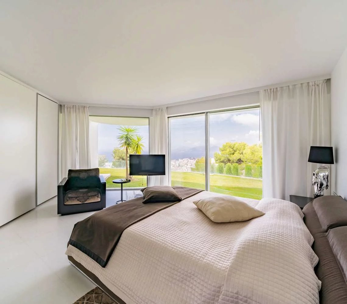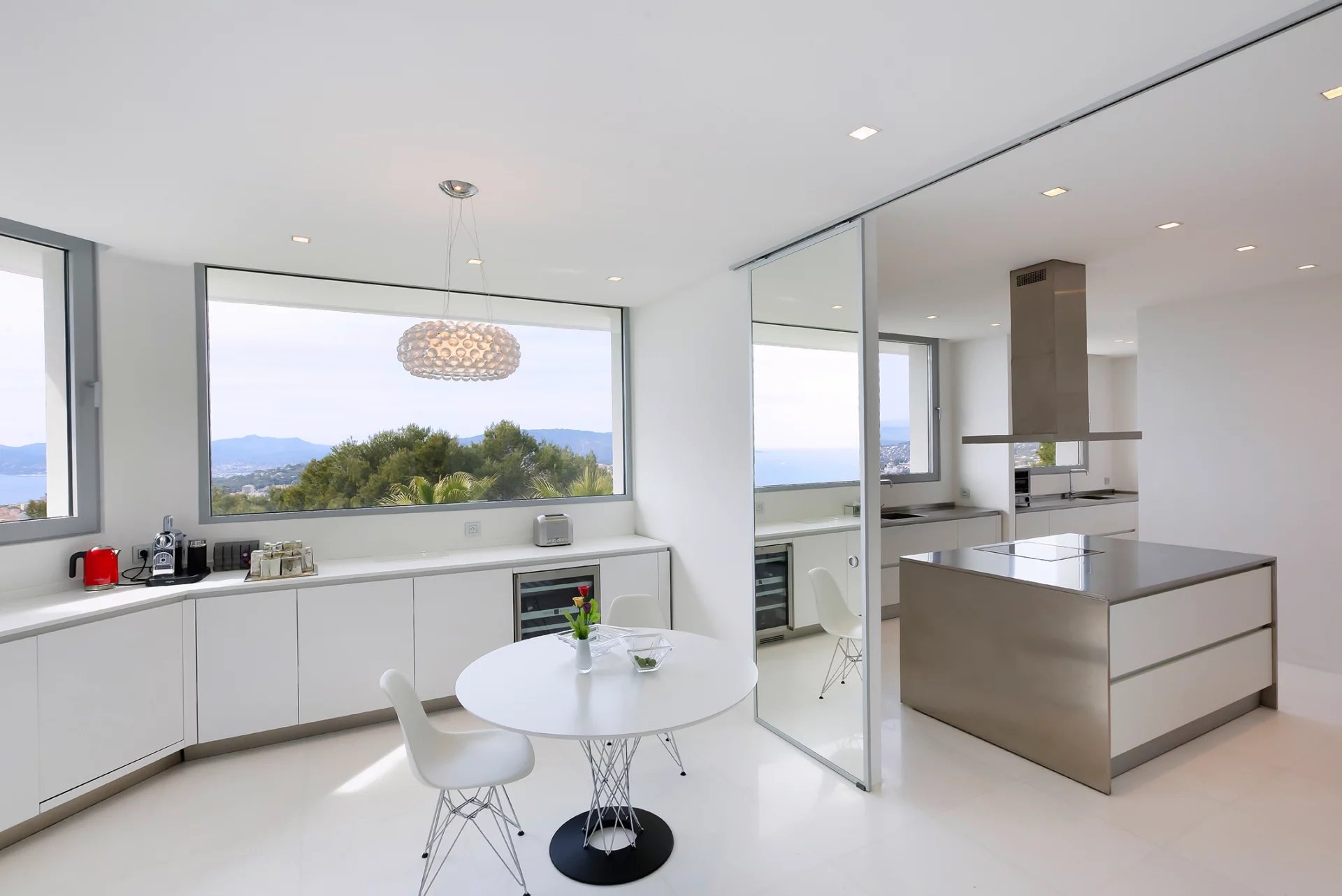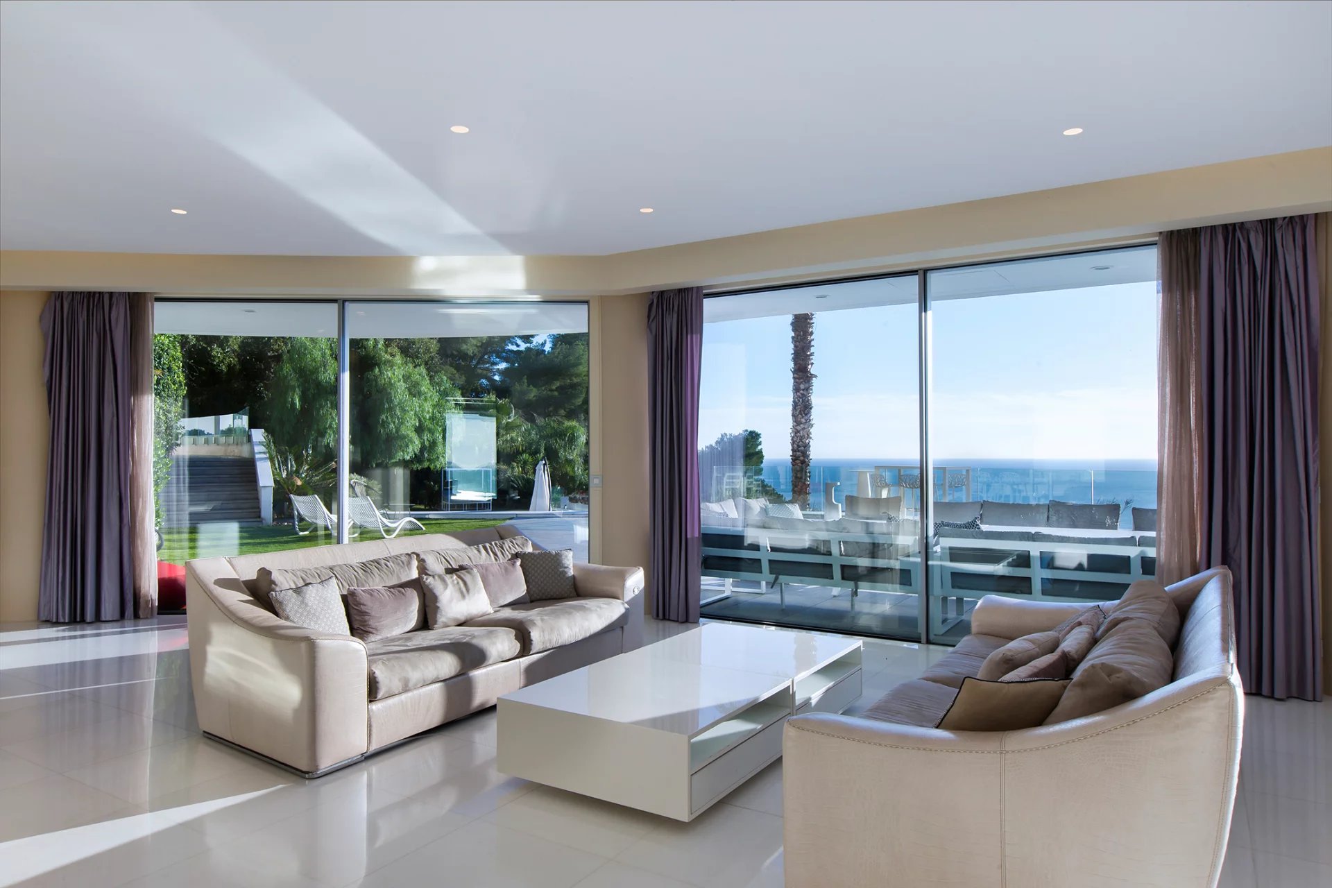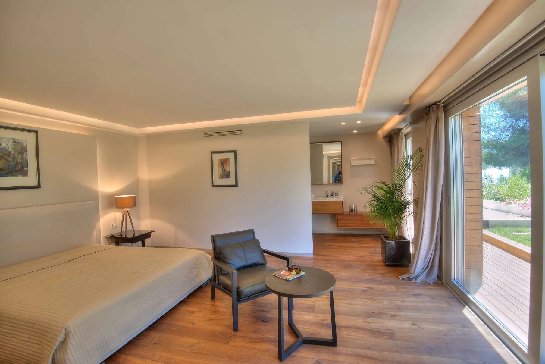 In an exclusive area of Cannes Californie, this spectacular contemporary villa represents the pinnacle of French Riviera luxury real estate. The architectural masterpiece, commanding breathtaking views across the Bay of Cannes and the Esterel mountains, stands as a testament to modern Mediterranean living. Set on a 13,750-sqm plot, the 2,000-sqm residence seamlessly blends indoor and outdoor living spaces, exemplified by floor-to-ceiling windows that frame the azure Mediterranean waters. The property's curved elements create a harmonious dialogue with its surroundings, while a cascading series of terraced gardens enhances the estate's privacy. The interior showcases unparalleled attention to detail, featuring a triple reception room bathed in natural light and adorned with crystal chandeliers. A sophisticated dining area and professional-grade kitchen cater to grand entertaining, while ten bedrooms, including two master suites, offer the ultimate in luxury accommodation. The property's dedication to leisure is evident in its comprehensive amenities, including a state-of-the-art spa complex, private cinema, and professional gym. The infinity pool, seemingly suspended above the Côte d'Azur coastline, provides a stunning centerpiece to the extensive outdoor living spaces. A fully equipped pool house adds convenience for outdoor entertaining. The property's practical considerations haven't been overlooked, with staff quarters and garage facilities for 15 vehicles. This exceptional residence represents a rare opportunity to acquire one of Cannes' most prestigious properties, offering both the privacy of a secure estate and proximity to the sophisticated amenities of the French Riviera's most celebrated resort town.