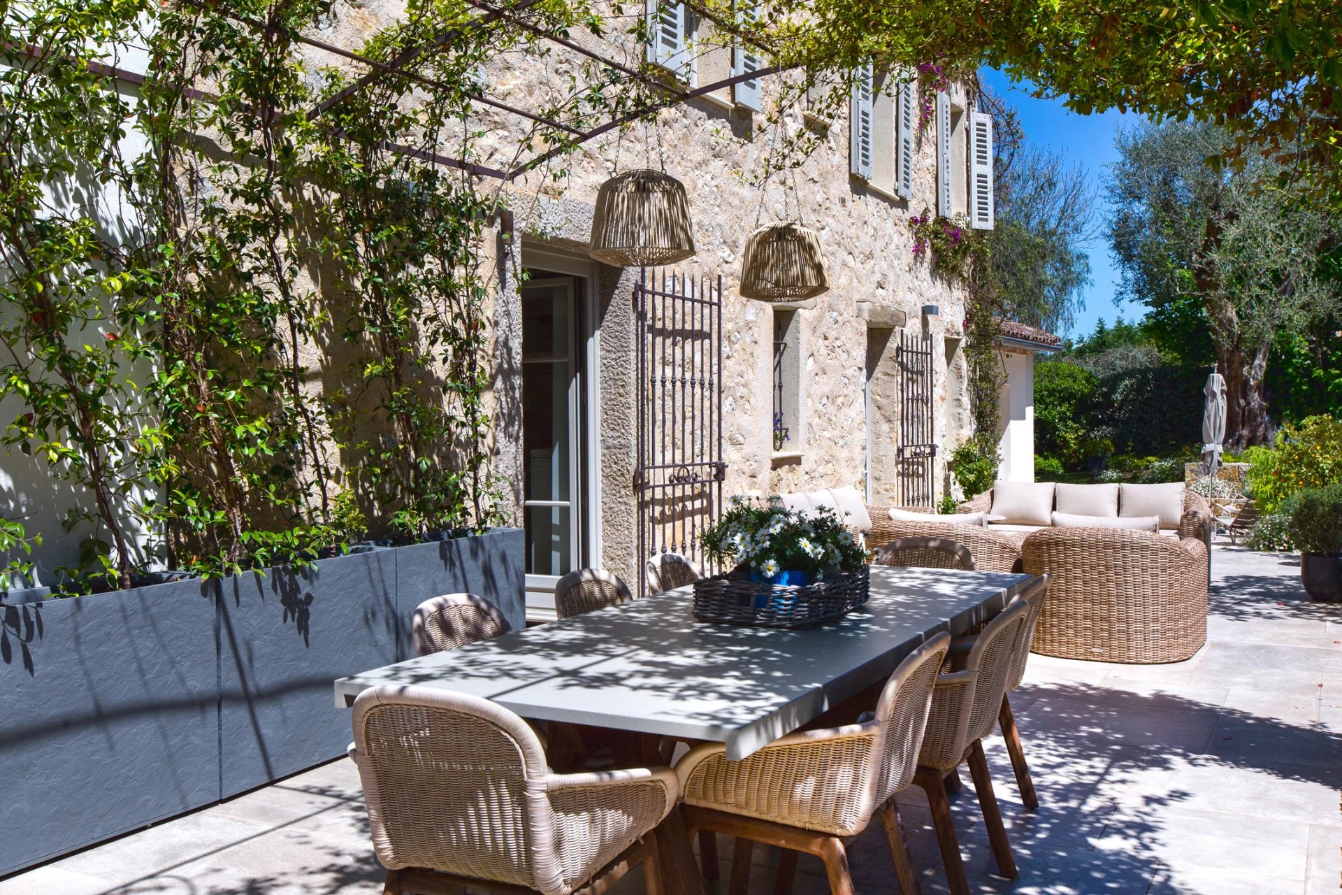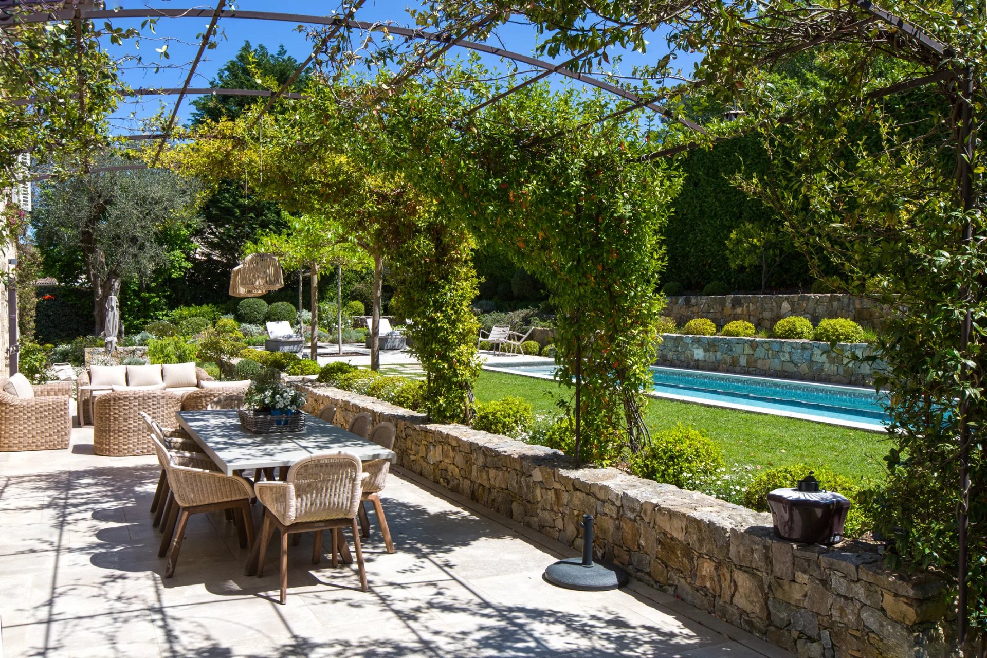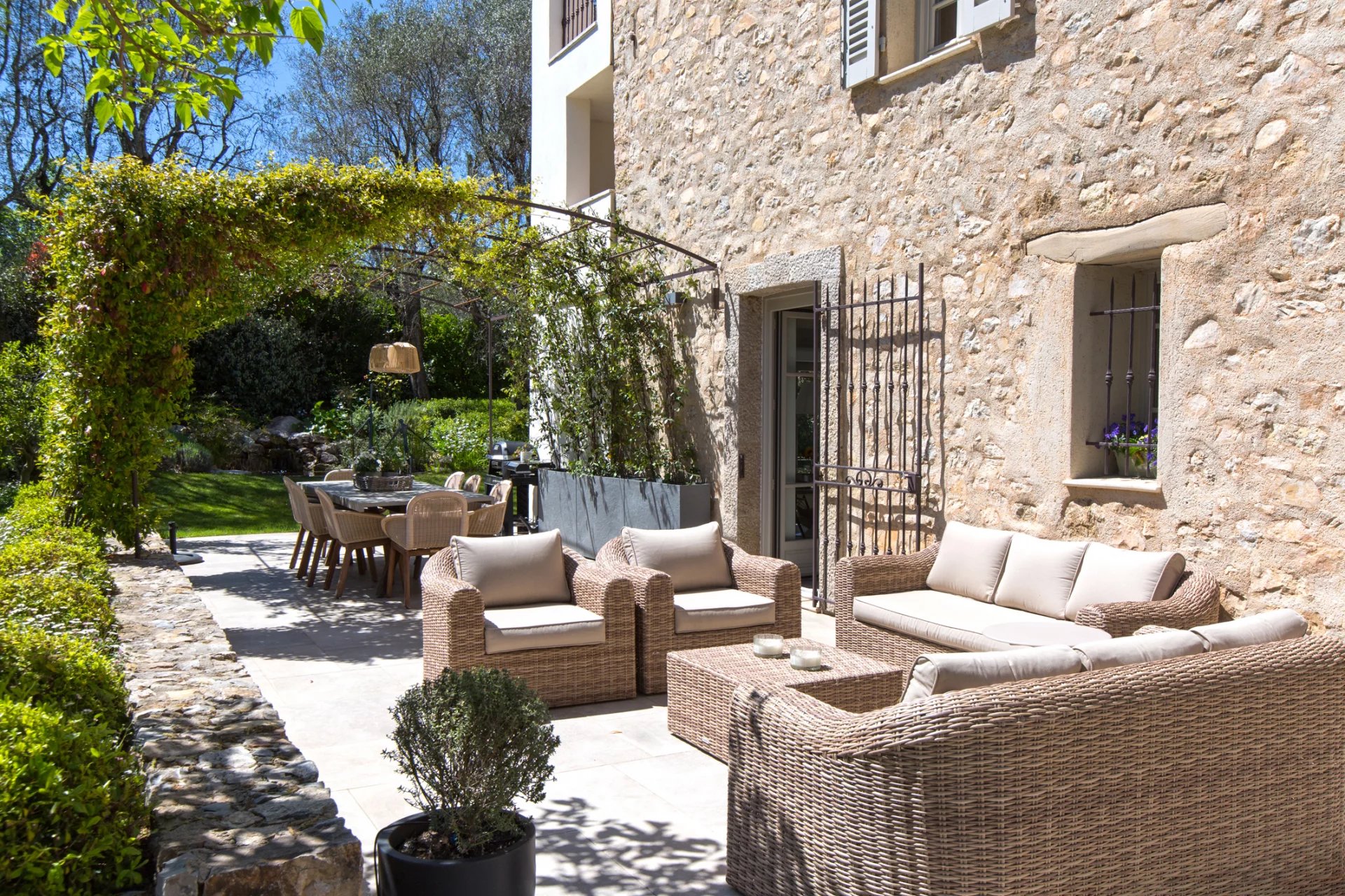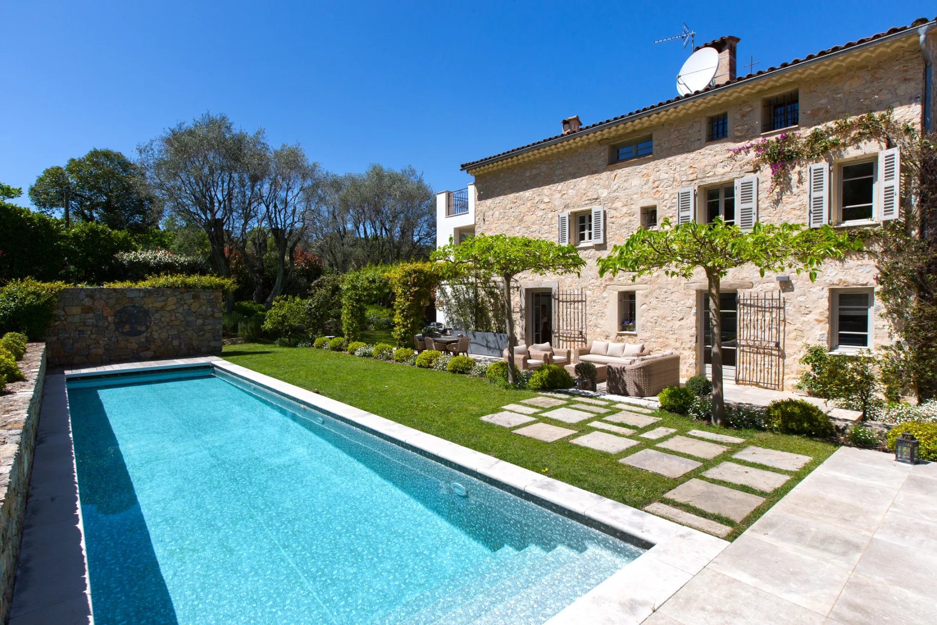 This 18th-century stone residence a short stroll from Valbonne's village center epitomizes Provençal charm with modern refinement. The property features traditional stonework, a meticulously landscaped garden with olive trees, and a swimming pool that captures the region's essence. Internally, the home preserves historical elements like exposed beams, complemented by contemporary design. Spacious living areas include a fireplace-adorned living room, a dining room, and a sleek kitchen. Five bedrooms and four bathrooms offer luxurious accommodation. Outdoor spaces are equally impressive, with multiple terraces including a jasmine-covered pergola ideal for alfresco dining. The landscaped grounds create a private sanctuary, featuring a tranquil water feature and Mediterranean plantings. A masterful restoration, this property beautifully balances historical authenticity with modern comfort, offering a unique opportunity to experience Provençal living.