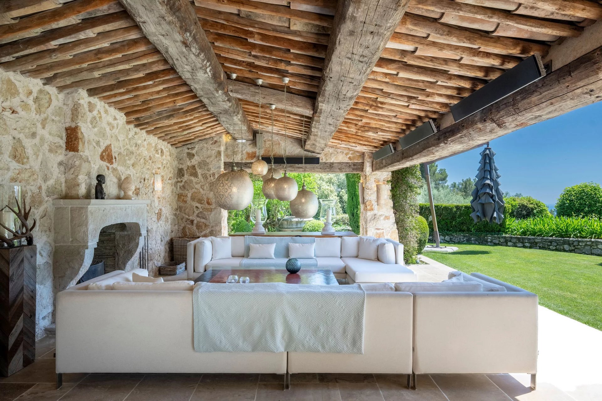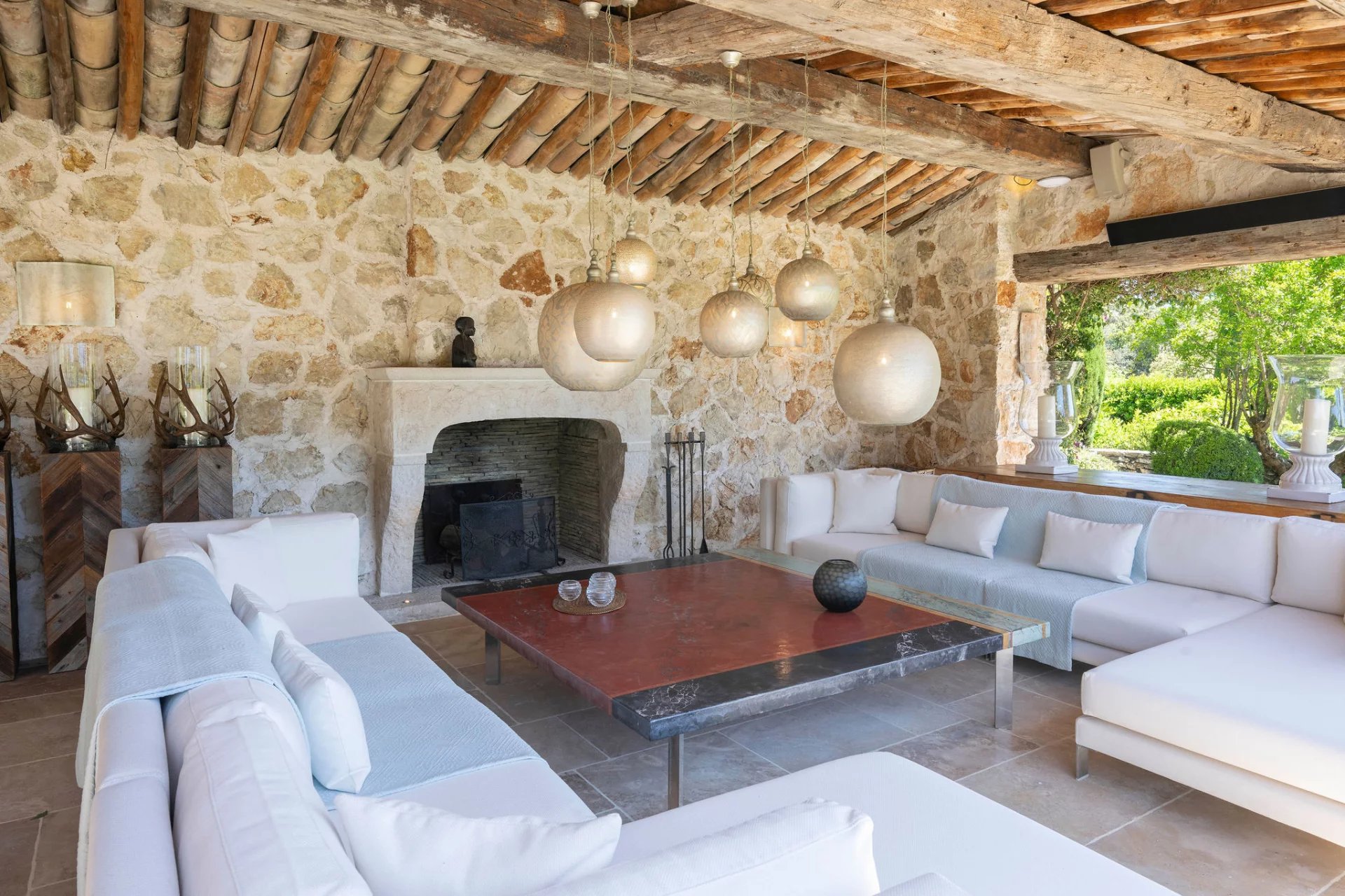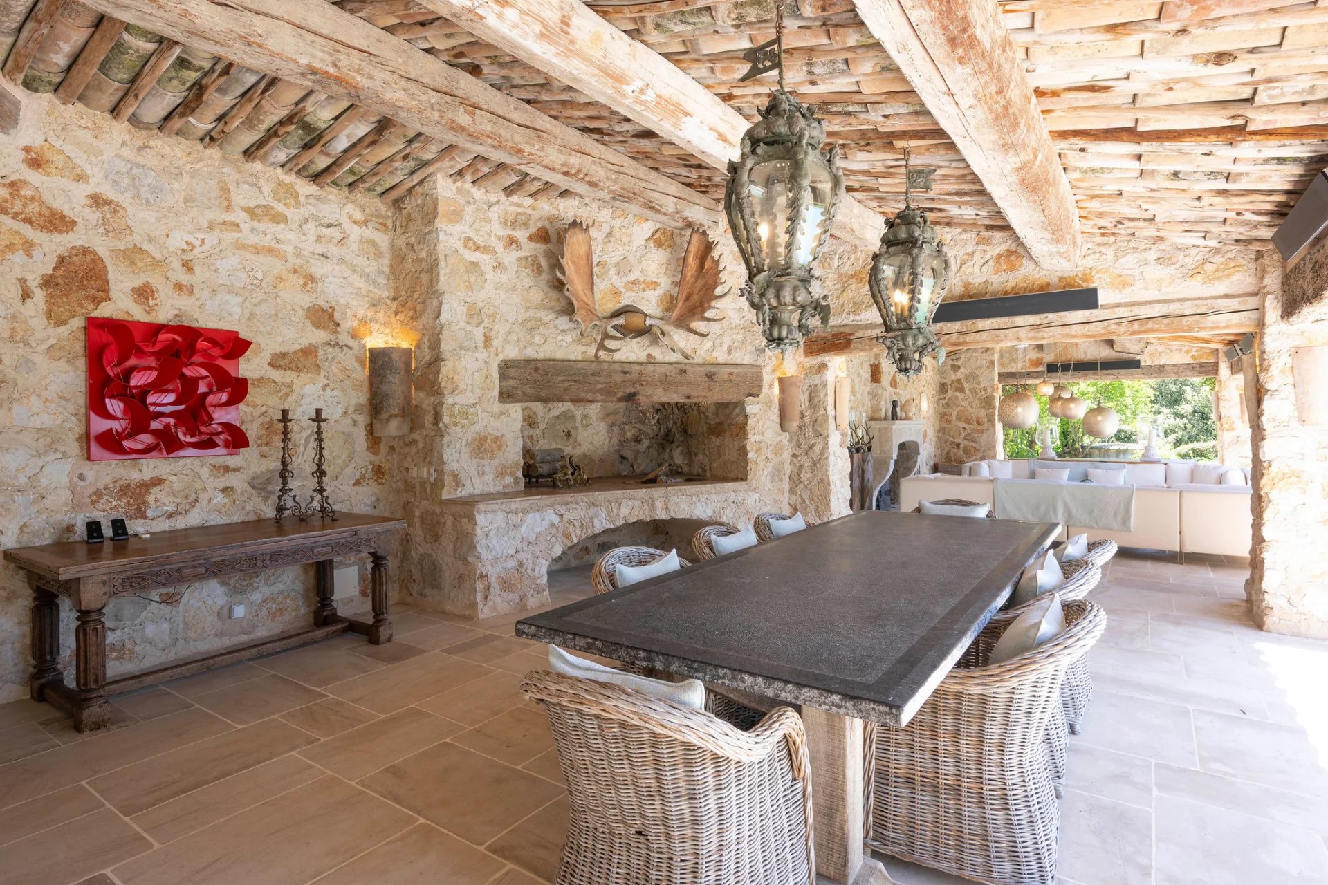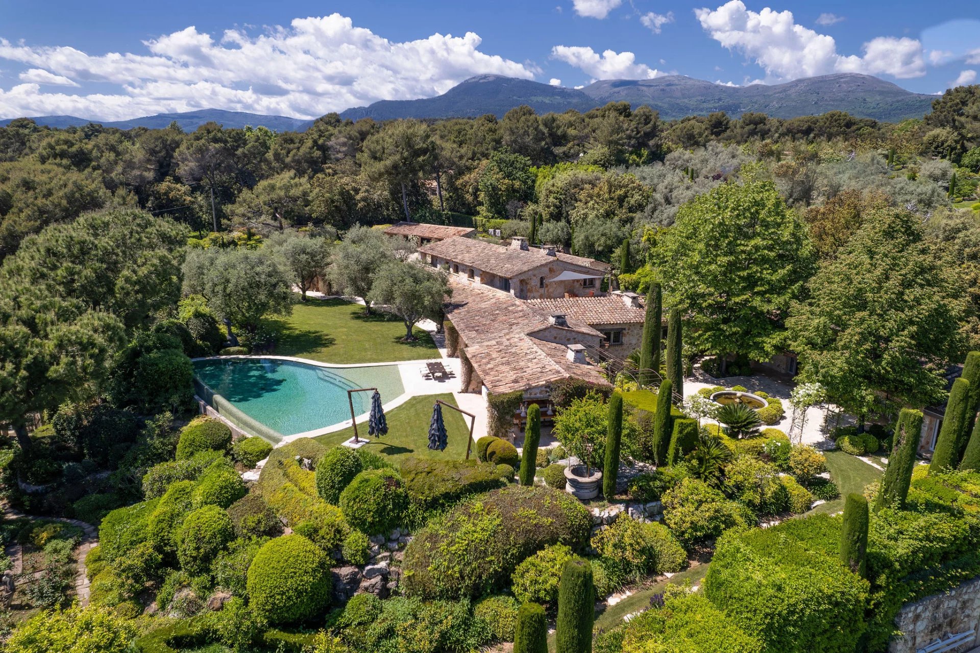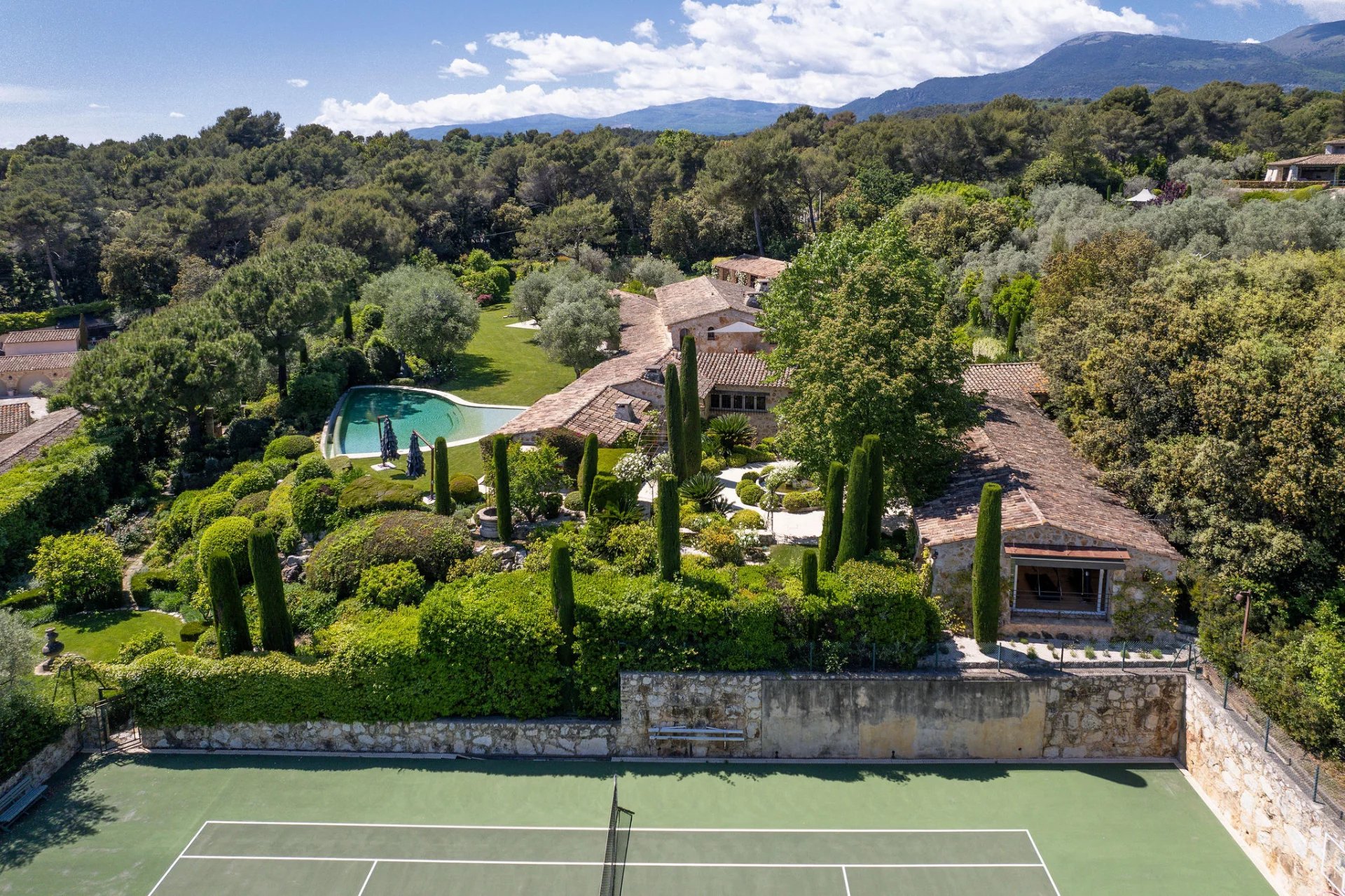 Set in absolute peace and privacy, this stone bastide combines timeless elegance with modern comfort, surrounded by beautifully landscaped grounds and enjoying panoramic sea views. The main house offers seven bedrooms, including a refined principal suite, as well as several independent guest accommodations. Interiors blend the character of stone and exposed beams with contemporary finishes. Features include an infinity pool, a professional tennis court, a fully equipped gym, a separate office, staff quarters, and an exceptional rock-carved wine cellar with tasting area. Generous terraces and shaded outdoor dining spaces complete the property. The Mediterranean garden—meticulously designed with sculpted topiary, tranquil ponds, natural cascades and lush planting—creates a rare sense of serenity.