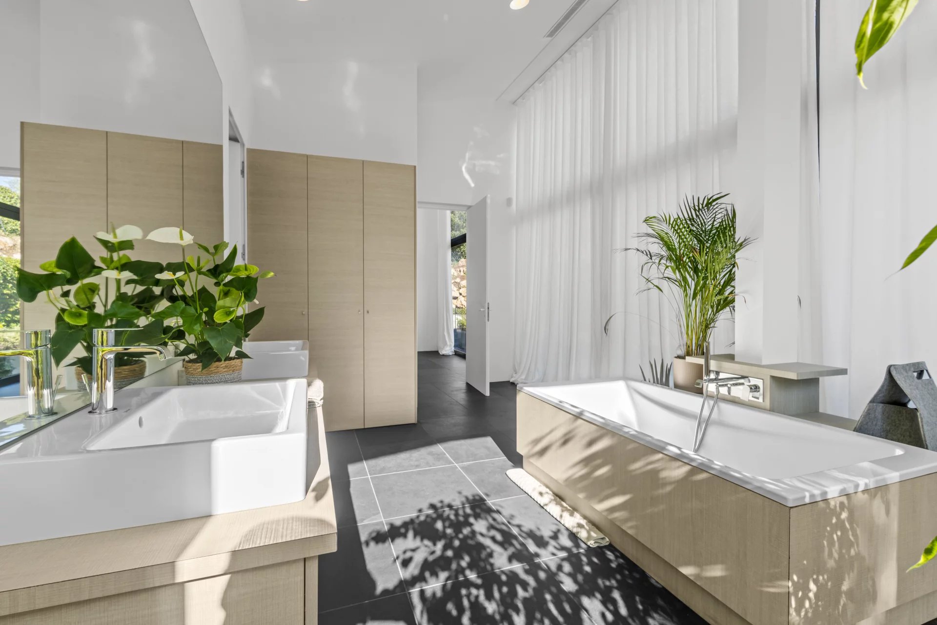 Perchée sur les collines ondulantes de Tanneron, cette villa contemporaine—magistralement conçue par l'architecte belge Augustin Rubbers—offre des vues panoramiques sur les montagnes. Le niveau principal baigné de lumière comprend un double salon avec cheminée, où les fenêtres du sol au plafond encadrent le paysage comme une œuvre d'art vivante. L'esthétique minimaliste de la propriété se poursuit au rez-de-chaussée à travers une salle à manger spacieuse et une cuisine élégante sous un plafond spectaculaire à double hauteur. Le niveau principal comprend également une luxueuse suite principale avec dressing et salon, 2 autres chambres avec salles de bains privatives, et une buanderie. Au deuxième étage, 3 chambres supplémentaires avec salles de bains privatives et accès direct au jardin offrent un ample hébergement pour les invités. À l'extérieur, le terrain atteint une perfection géométrique avec une impressionnante piscine de 34 mètres qui s'étend le long des pelouses soigneusement entretenues, ponctuées de cyprès italiens. Des jardins méticuleusement planifiés avec des arbres fruitiers complètent ce sanctuaire moderniste où la précision architecturale rencontre lasensibilité méditerranéenne.