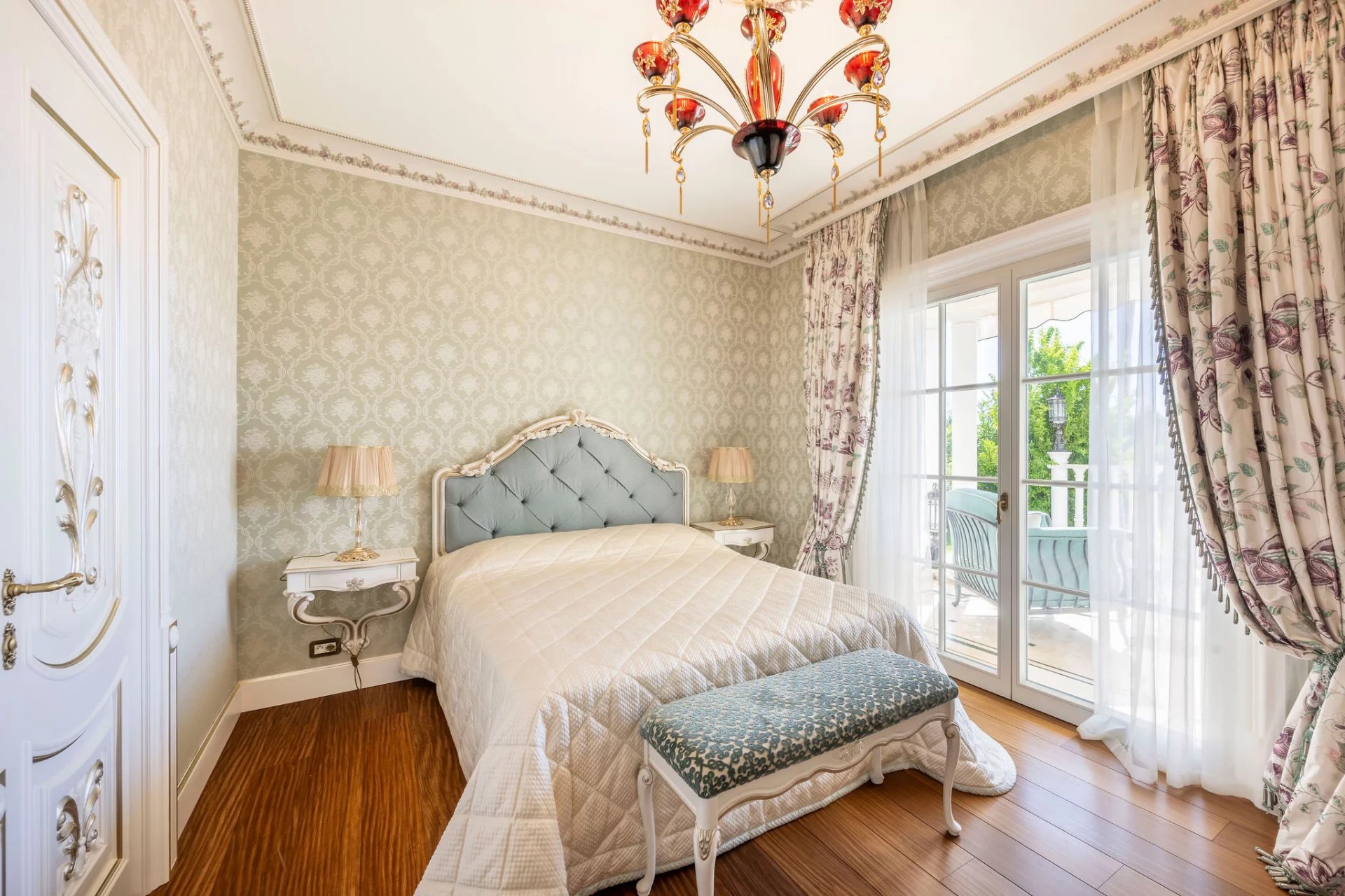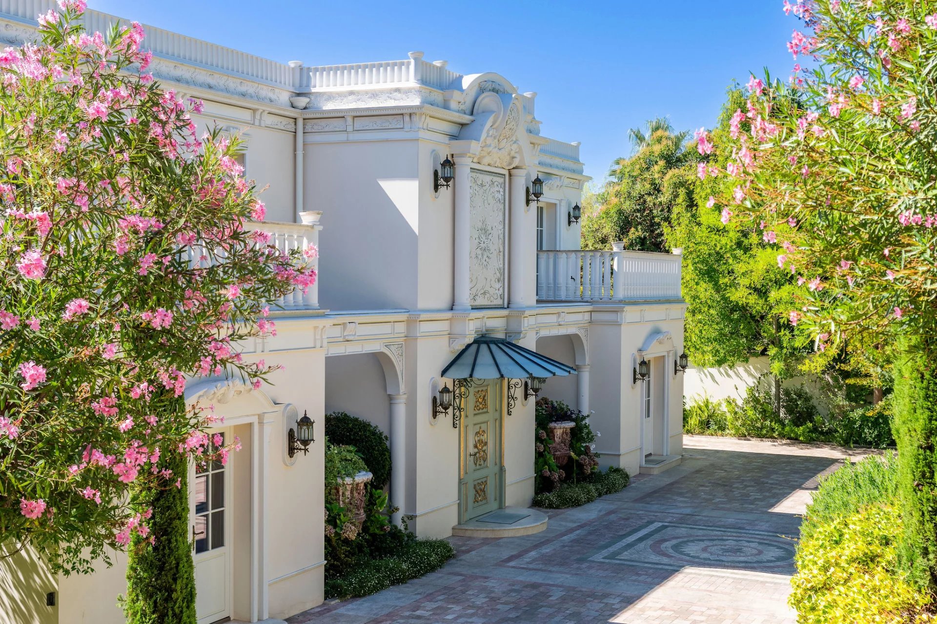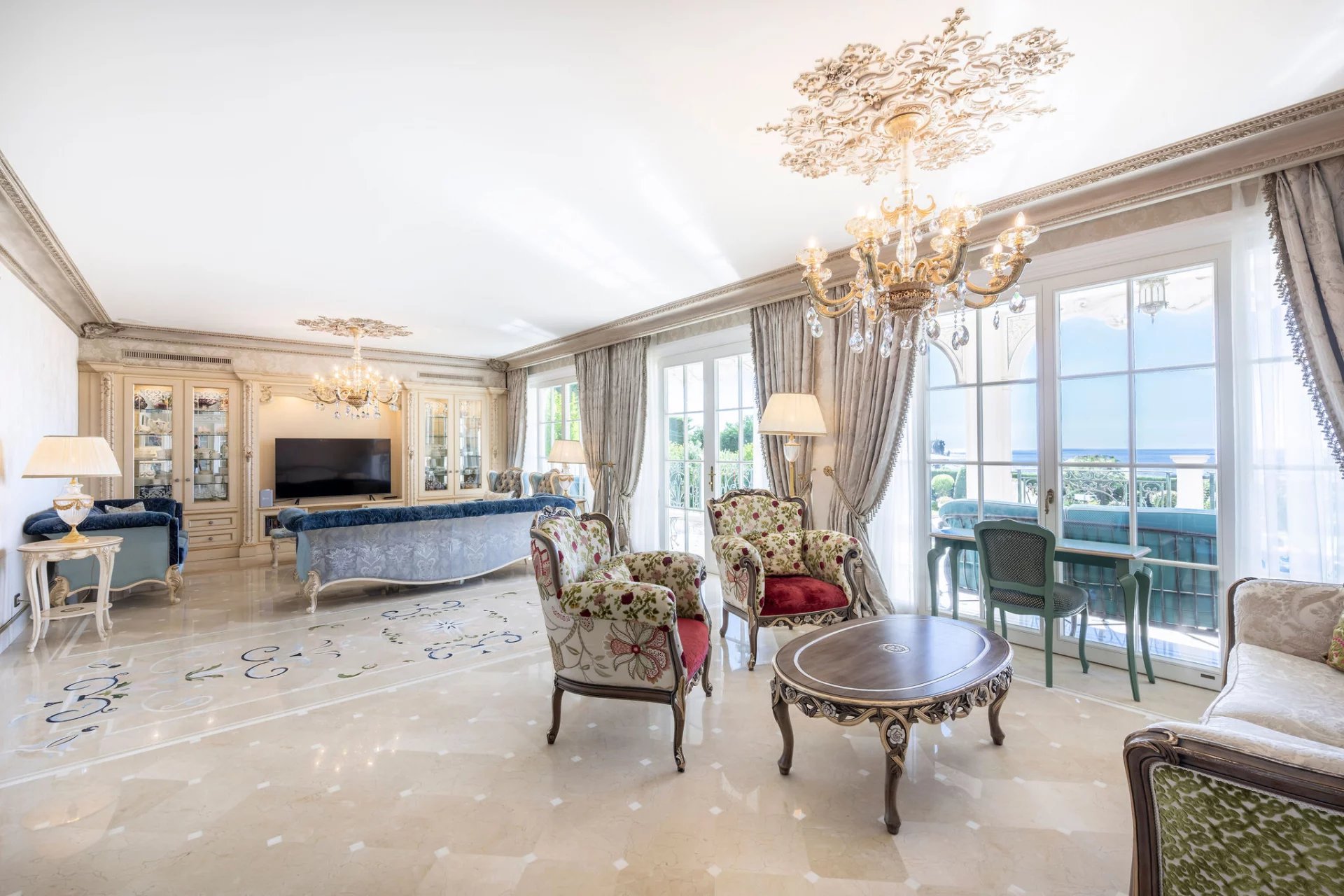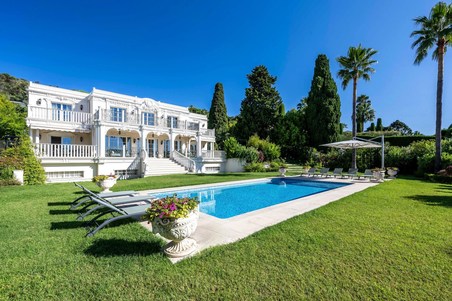 Cette imposante villa néoclassique à Super Cannes s'érige comme un monument à l'art de vivre méditerranéen raffiné, où les éléments architecturaux d'inspiration baroque créent immédiatement une atmosphère de grandeur. La façade symétrique avec son impressionnant escalier central, ses balustrades en fer forgé ornées et ses colonnes classiques établit une présence majestueuse au milieu de jardins méticuleusement paysagés. Les intérieurs reflètent un engagement envers l'élégance aristocratique, avec de somptueuses moulures au plafond, des lustres en cristal et des boiseries richement détaillées. Les espaces de vie arborent une palette de crèmes et de pastels doux, complétée par des sols en marbre incrustés de motifs décoratifs. Le salon s'ouvre sur des vues panoramiques de la mer à travers des portes-fenêtres, tandis que la suite principale poursuit le thème du luxe royal avec un accès à une terrasse privée. La cuisine allie un savoir-faire traditionnel et des fonctionnalités modernes, avec des armoires sur mesure et des surfaces en granit haut de gamme. Les 7 chambres sont complétées par un appartement d'invités séparé assurant l'intimité des visiteurs. Le domaine extérieur est tout aussi impressionnant, centré autour d'une piscine azur qui reflète la mer.