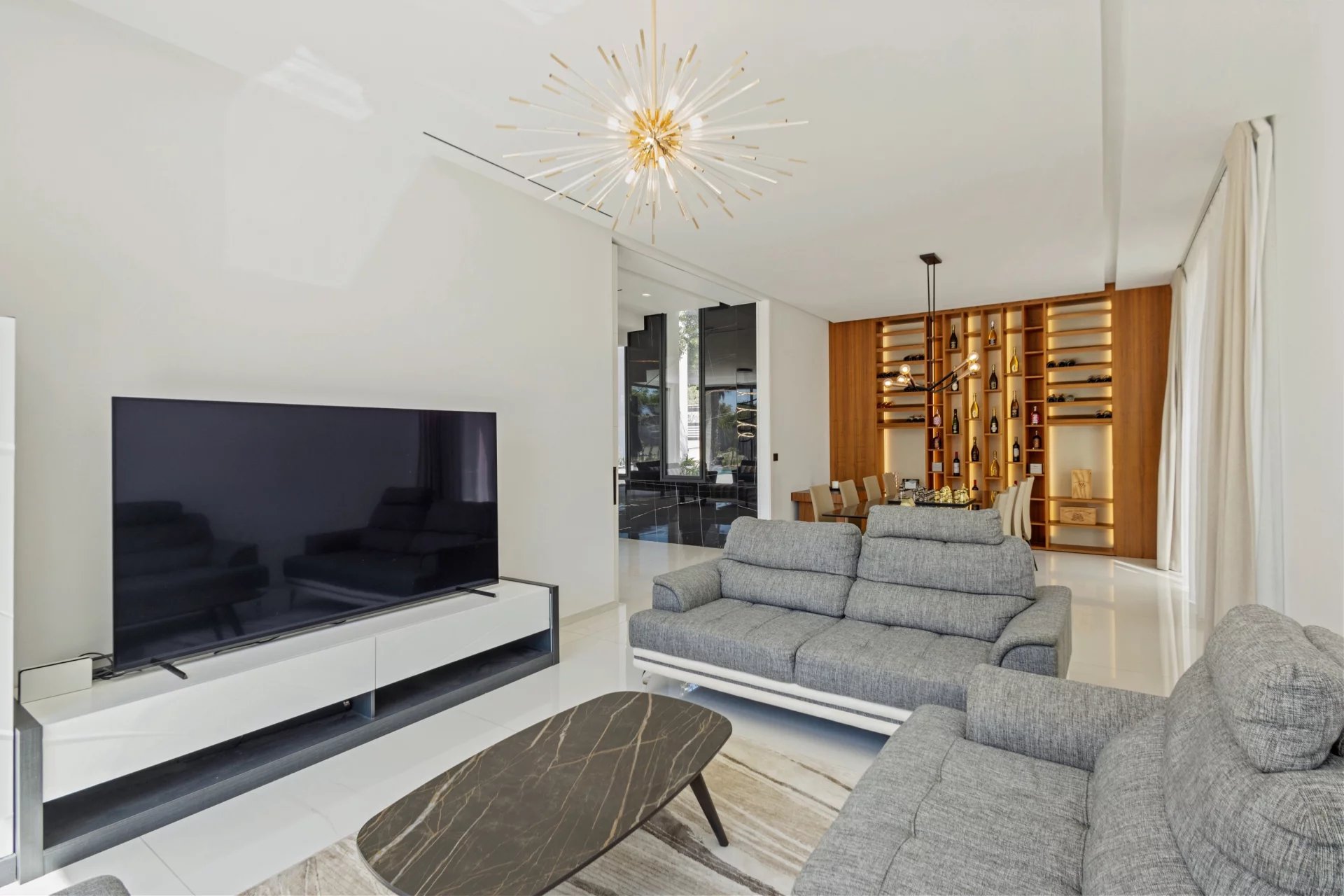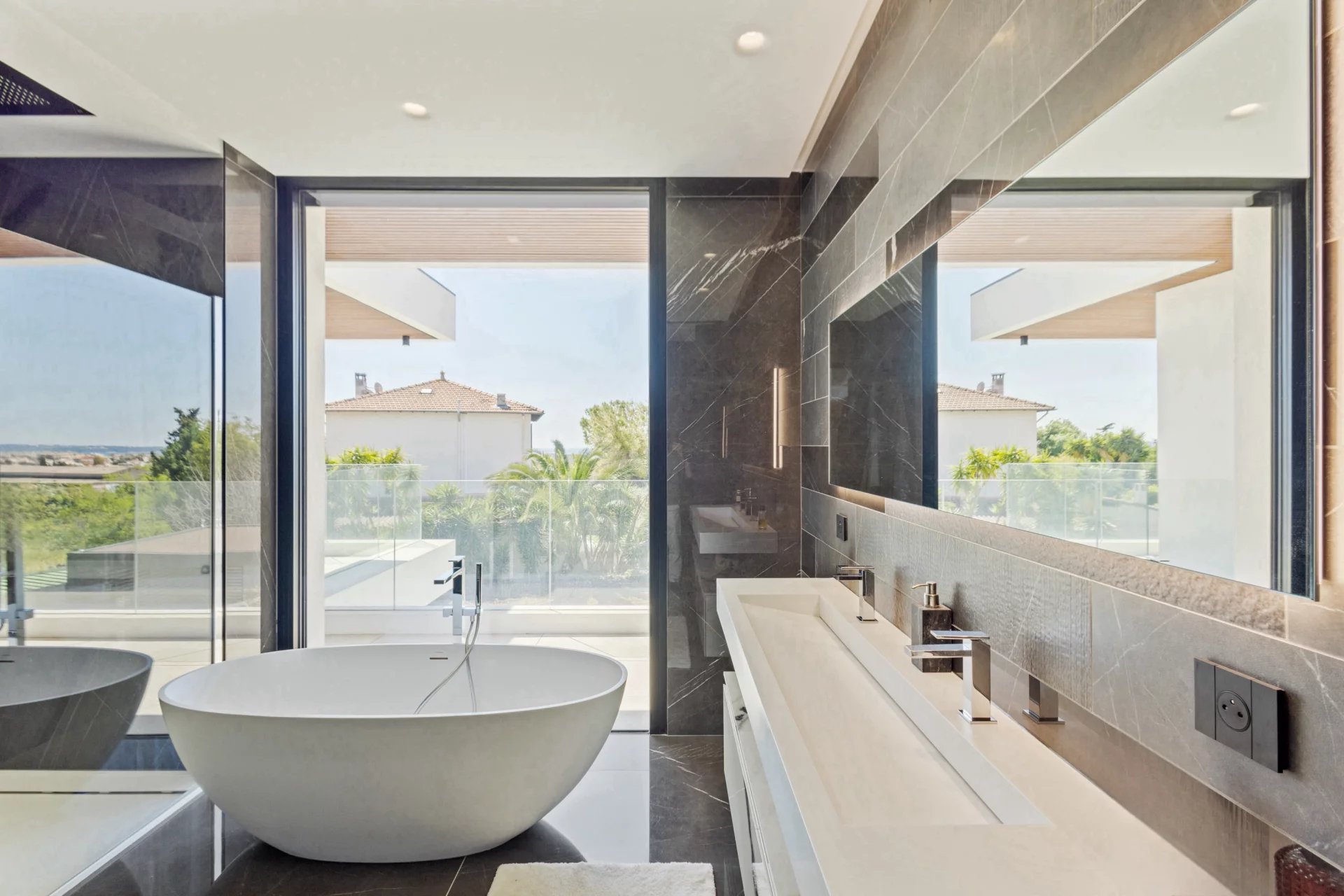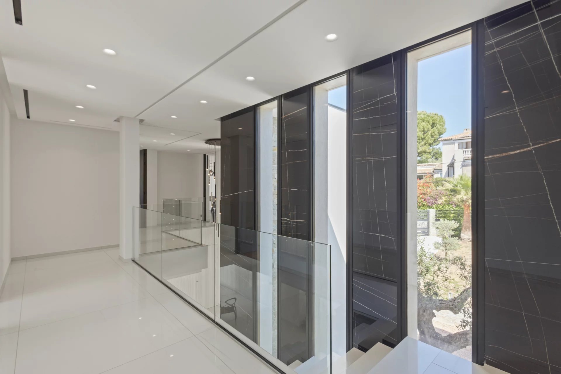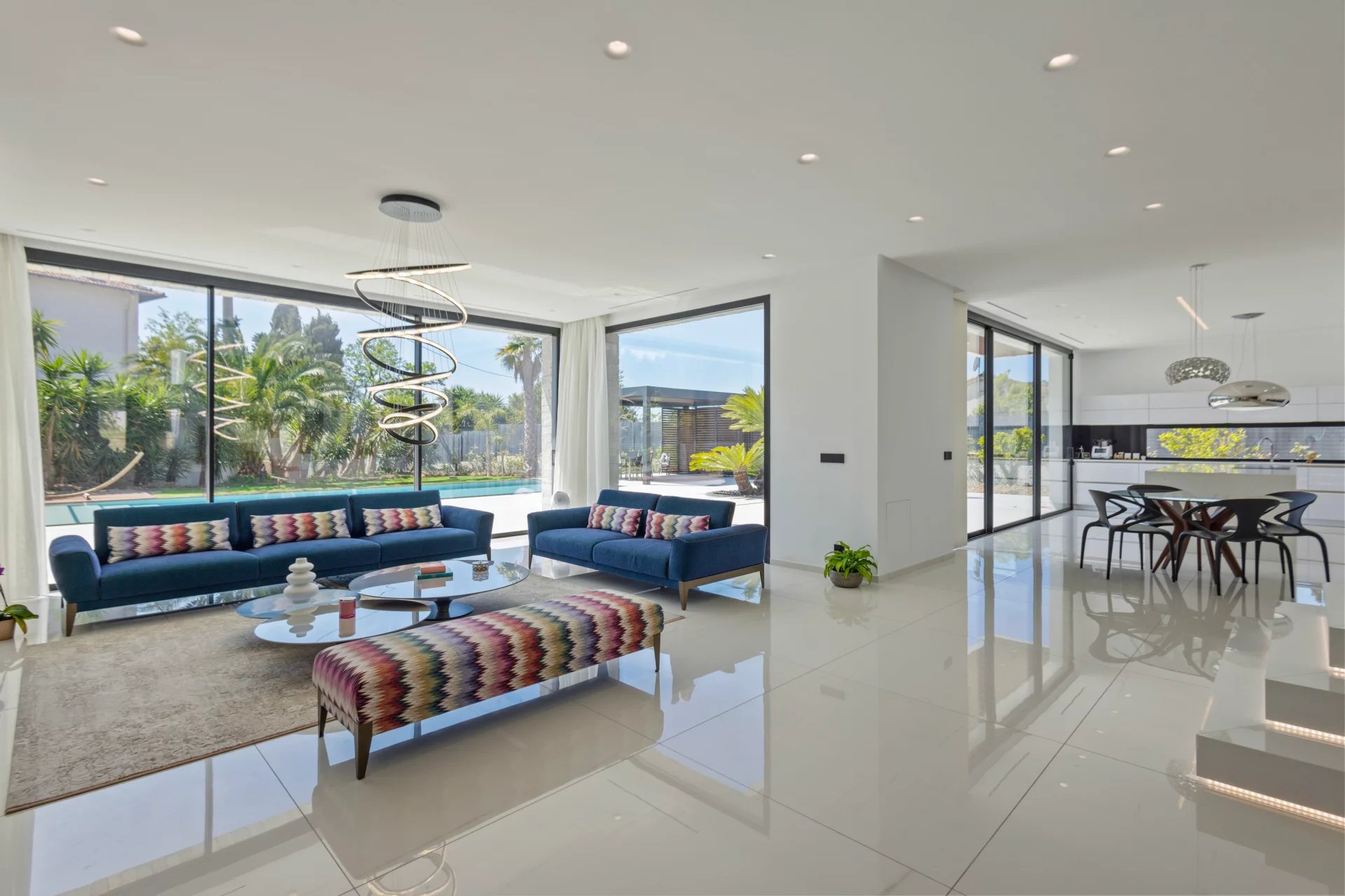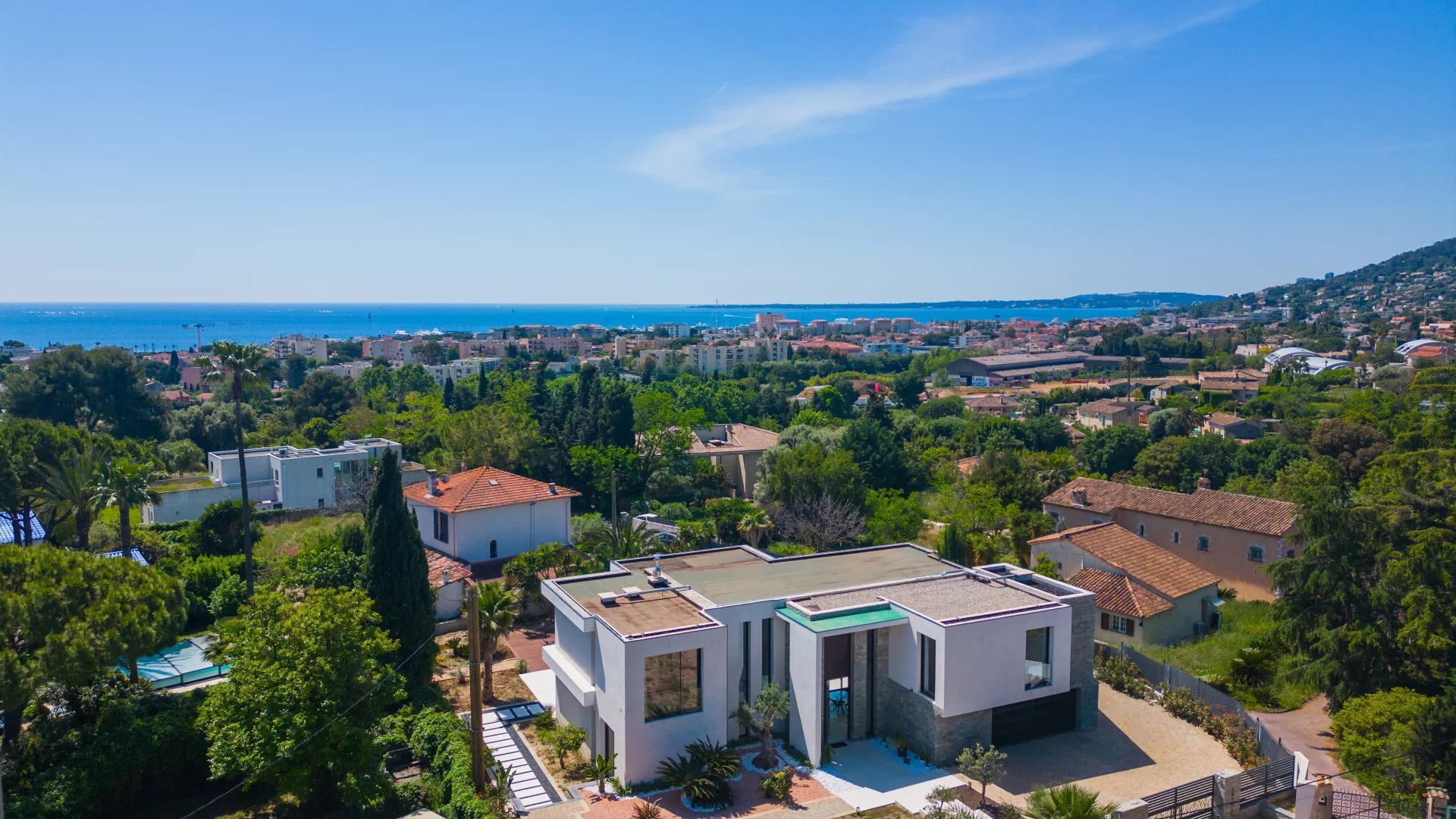 Cette villa moderniste représente l'art de vivre luxueux méditerranéen, mélangeant harmonieusement des formes géométriques audacieuses avec une atmosphère chaleureuse et accueillante. Située dans un quartier calme et recherché d'Antibes, cette résidence de 322 m² met en valeur une précision architecturale exceptionnelle à travers accents en pierre et ses murs de verre qui dissolvent les frontières entre les espaces intérieurs et extérieurs. L'intérieur présente un espace de vie ouvert et lumineux, agrémenté de luminaires design et de mobilier contemporain qui apportent des touches de couleur contrastant avec l'intérieur blanc immaculé. La cuisine ultramoderne équipée d'appareils haut de gamme intégrés et d'un îlot élégant s'ouvre directement sur la terrasse de la piscine. 5 chambres en suite comprennent une somptueuse suite principale avec de généreux espaces de dressing. Les jardins méticuleusement aménagés présentent des plantations méditerranéennes entourant une piscine qui reflète les lignes architecturales de la maison. Avec son garage et son système domotique complet, cette propriété offre un standard de luxe sans compromis à quelques minutes de toutes les commodités.