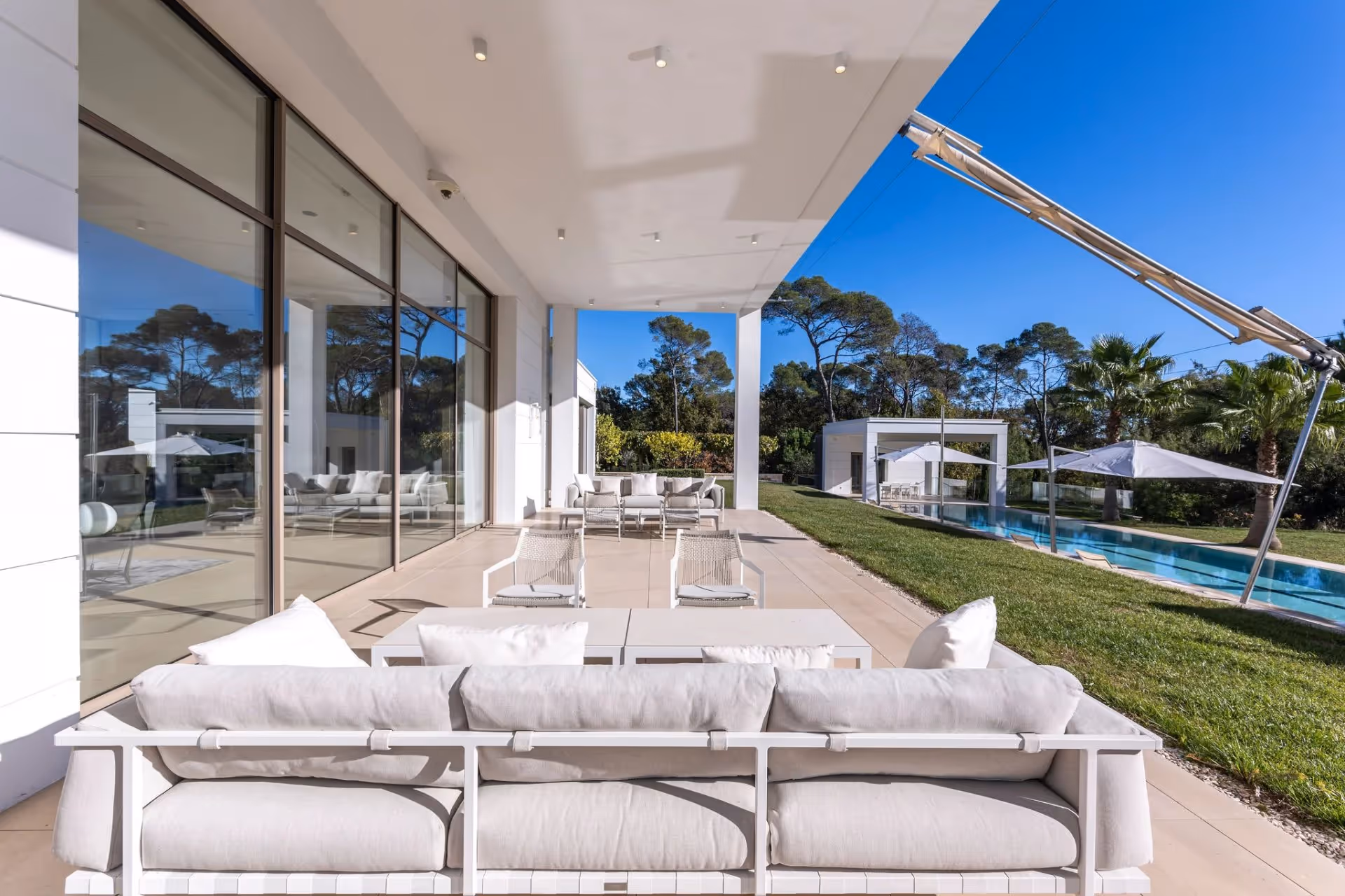 Co-exclusivité: Dans une adresse convoitée de Mougins, ce chef-d'œuvre architectural redéfinit l'art de vivre contemporain de luxe par ses volumes géométriques audacieux et son intégration harmonieuse avec le paysage environnant. Établie sur 1,3 hectares de jardins méticuleusement paysagés, la propriété présente une silhouette saisissante avec ses façades blanches immaculées, ses éléments de toiture végétalisée et son système d'éclairage LED spectaculaire qui transforme le domaine à la tombée de la nuit. L'intérieur spacieux de 1 100 m² révèle un design spatial exceptionnel, avec des plafonds majestueux et des murs de verre créant une atmosphère de lumière et d'espace sans limite. La remarquable salle de réception sert de pièce maîtresse, une cuisine ultramoderne qui se fond dans une élégante salle à manger. 9 somptueuses chambres en suite, incluant une magnifique suite principale offrent un confort inégalé. Les équipements complets comprennent un cinéma professionnel, un spa serein avec sauna, une cave à vin à température contrôlée et Un ascenseur discret relie les multiples niveaux de la villa. À l'extérieur, la spectaculaire piscine chauffée de 25 mètres s'étend depuis la structure principale, complétée par un pool house entièrement équipé. La fonctionnalité du domaine est renforcée par une résidence indépendante pour gardien, un garage généreux et de nombreuses places de stationnement. Cette propriété exceptionnelle représente le summum de la vie à la pointe de la technologie, avec des systèmes domotiques complets contrôlant chaque aspect de l'environnement avec une précision sans effort.