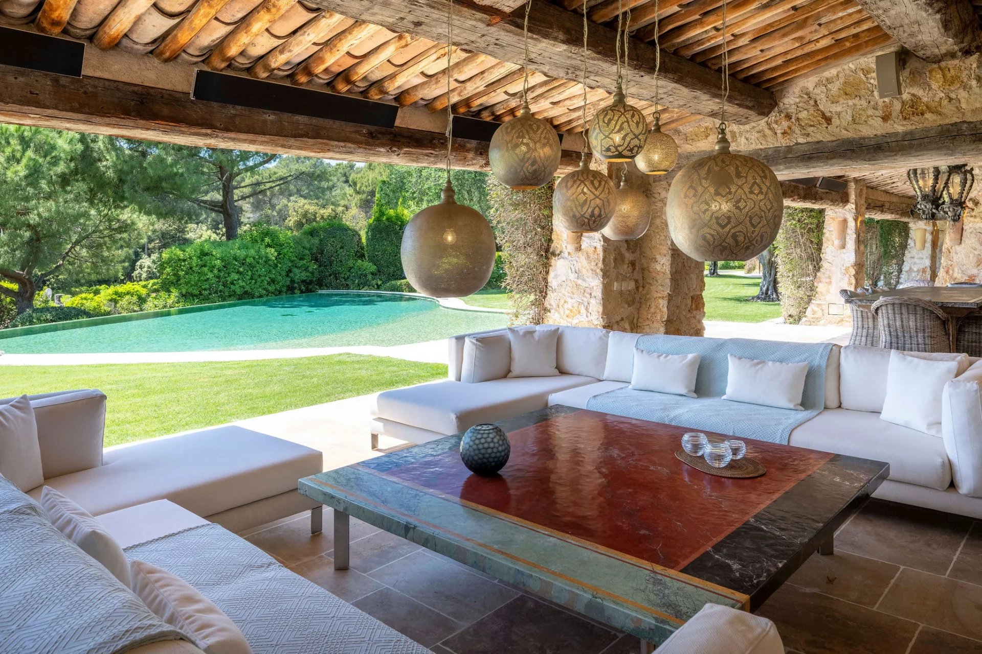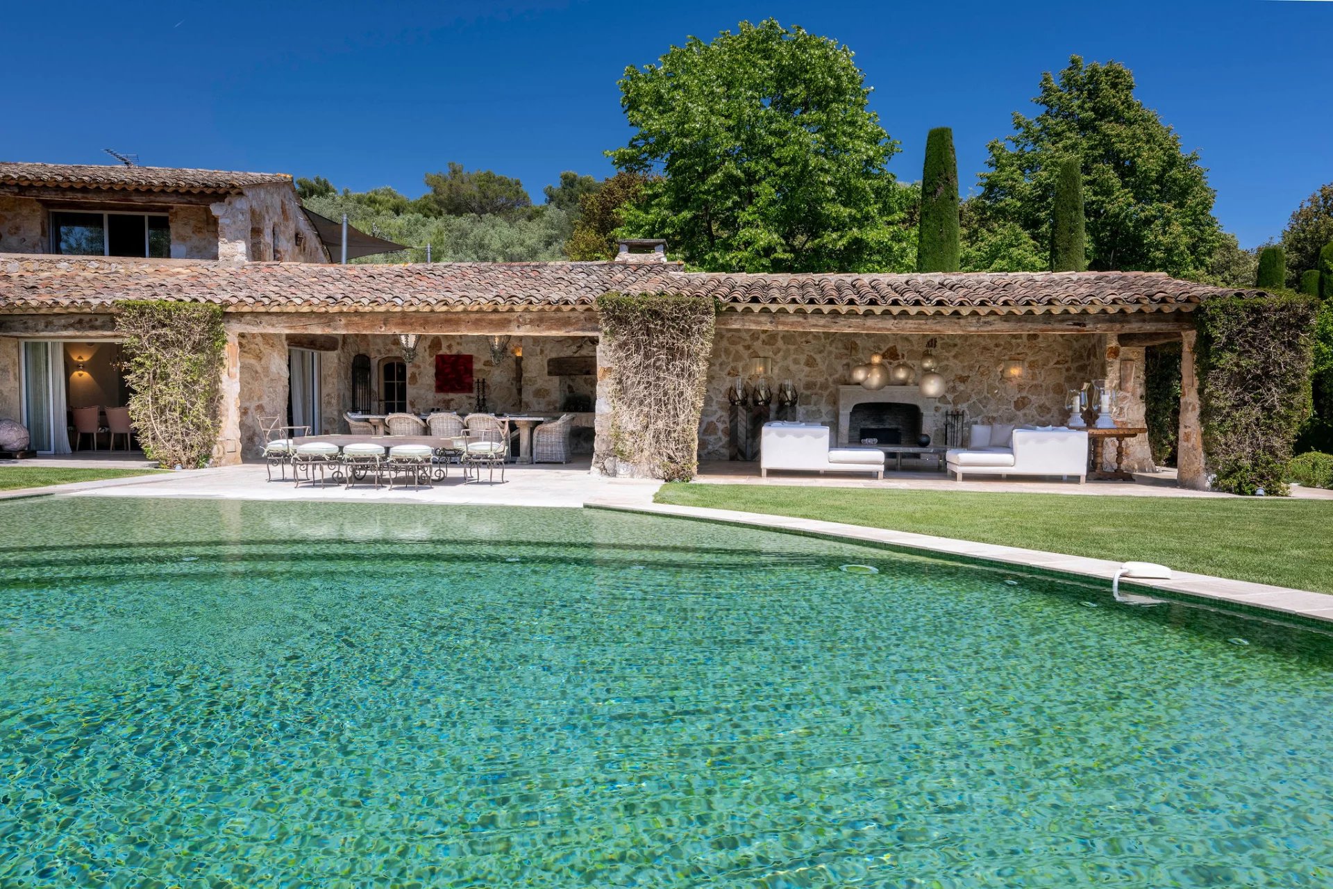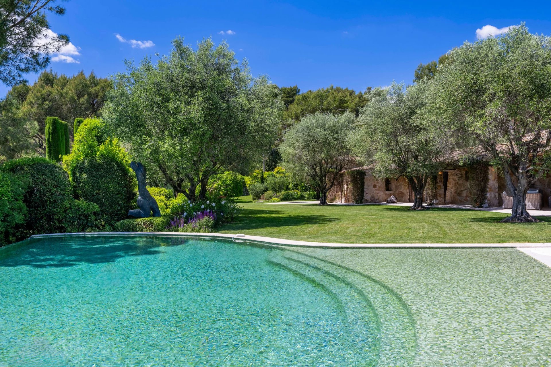 Nichée dans un écrin de verdure au calme absolu, cette somptueuse bastide en pierre offre une élégance intemporelle et un confort moderne au cœur de la Côte d’Azur. Entourée de jardins paysagers magnifiquement entretenus, la propriété bénéficie d’une vue panoramique sur la mer et d’équipements haut de gamme. La demeure principale comprend 7 chambres élégamment aménagées, dont une suite de maître raffinée, ainsi que plusieurs logements indépendants pour les invités. Les intérieurs marient avec subtilité le charme authentique de la pierre et des poutres apparentes à des matériaux nobles et contemporains. Pensée pour la convivialité et l’art de vivre, la propriété dispose de : -Une somptueuse piscine à débordement entourée d’oliviers et de pelouses soigneusement entretenues - Un court de tennis professionnel discrètement intégré au paysage - Une salle de sport entièrement équipée pour les amateurs de bien-être - Des logements pour le personnel ainsi qu’un bureau indépendant offrant fonctionnalité et intimité - Une cave à vin exceptionnelle avec espace de dégustation, creusée dans la roche - De vastes salons extérieurs et espaces repas ombragés par des arbres centenaires et des pergolas fleuries Le jardin méditerranéen est une véritable œuvre d’art : topiaires sculptées, cascades naturelles, bassins paisibles et une flore luxuriante créent une atmosphère de sérénité absolue.