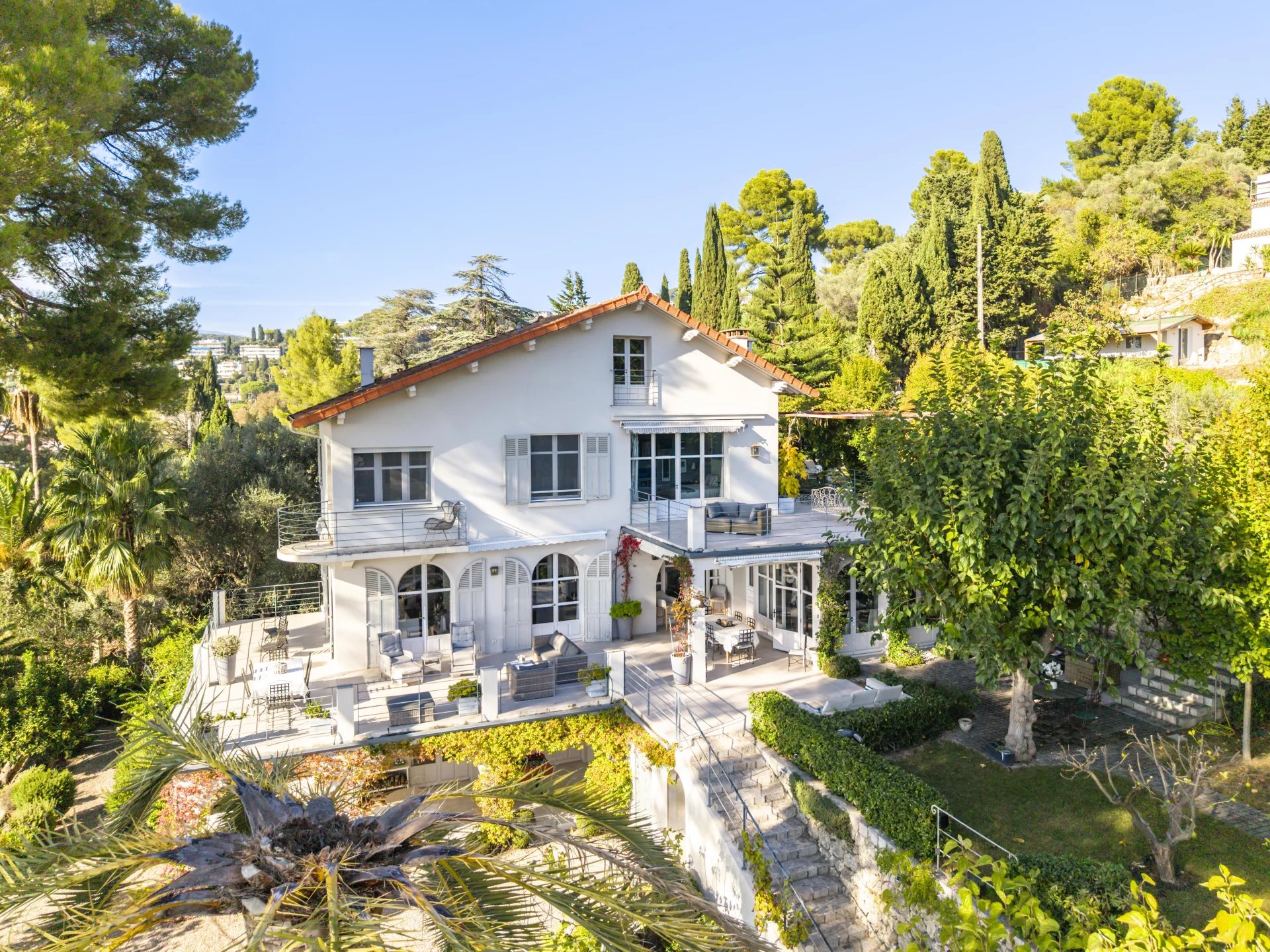 Cannes : située dans le quartier de la Californie/le Cannet, à quelques pas du centre-ville et des plages, cette villa bénéficie d'une vue mer,, d'une exposition sud et de la quiétude de son environnement. La Villa Les Cascades s’étend sur trois niveaux, auxquels s’ajoute un grenier aménagé. Le rez-de-chaussée comprend trois chambres, trois salles de bains, un WC invités, une cave à vin et une buanderie. Le premier étage comprend un double séjour avec deux cheminées, une très grande cuisine avec coin repas, une salle de musique et un bureau. L’étage supérieur est consacré aux chambres, avec trois chambres et trois salles de bains, dont une vaste suite parentale avec terrasse, salle de bains attenante et bureau, ainsi qu’une seconde suite parentale avec balcon. Au dernier niveau se trouve un grand loft conçu pour les enfants, comprenant un coin télévision, une salle de jeux / espace créatif, une chambre et une salle de bains complète. À l’arrière de la maison se trouve une grande piscine. La parcelle de 3 273 m² comprend également plusieurs dépendances.